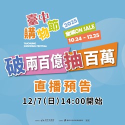 經發局提醒,12月7日下午2時,購物節將在大里公園舉辦「屯區GOGO購-破兩百億加碼抽百萬」活動,抽出今年第2個加碼百萬大獎及第二名外籍專屬抽1萬美金,現場還有憑台中通APP當日消費畫面兌換摸彩券,有70吋電視、50吋電視烤箱、氣炸鍋、廚餘機等多項精美家電好禮等您抽。詳細資訊請持續關注臉書粉絲團(https://www.facebook.com/shoppingtaichung/)。