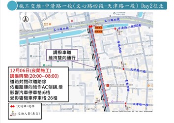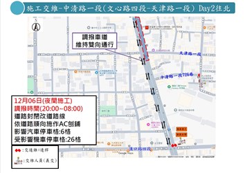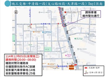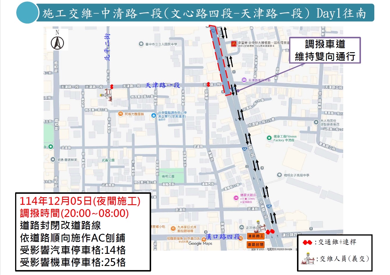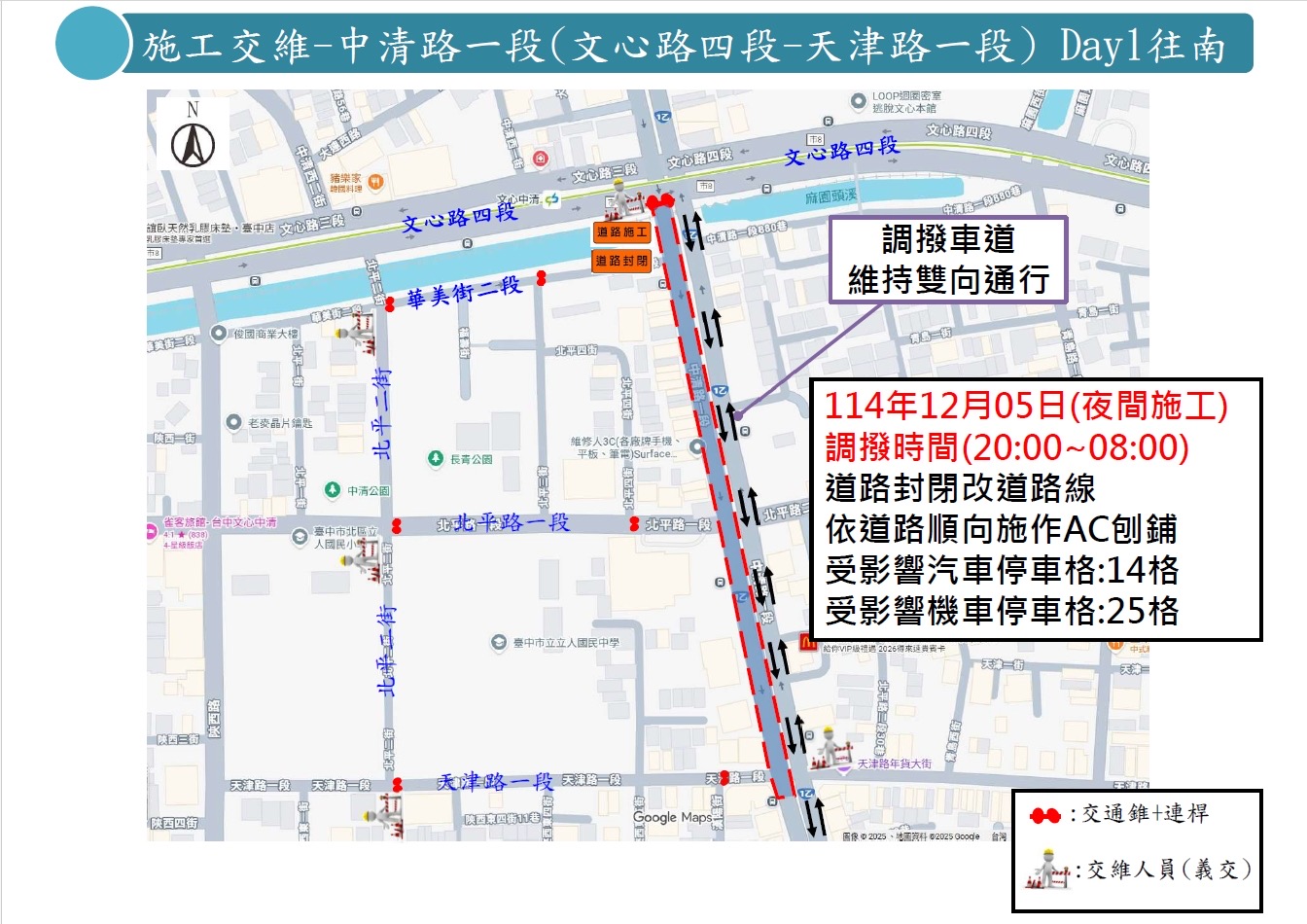 建設局長陳大田表示,市府持續推動各項人本改善工程,市長盧秀燕也特別重視行人安全與道路品質。為減少對白天交通的影響,這次工程採取夜間施工,並分段進行以確保道路通行。125日將施作天津路至文心路西側,126日再施工東側,主要作業包括路面刨除與重鋪。施工期間會依中央分隔島分段調撥車道並部分封閉,白天恢復通行;若單側提前完成,也會立即開放,並安排專人引導交通,靈活調整封閉範圍,兼顧行車順暢與施工品質。
