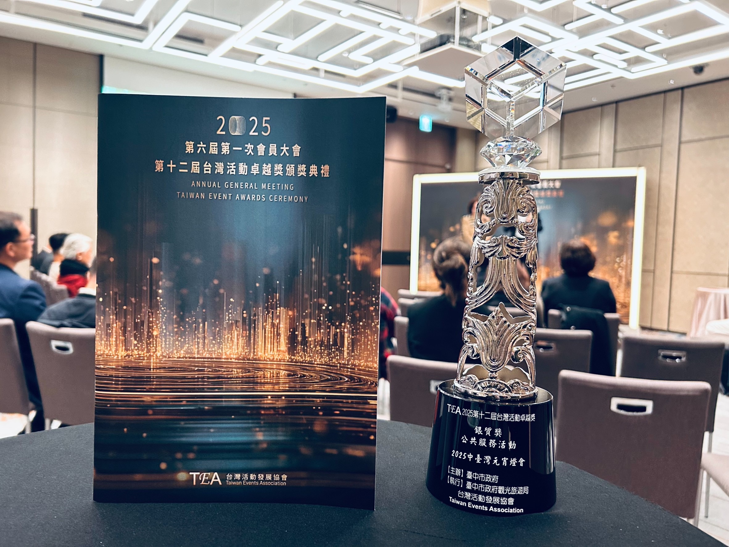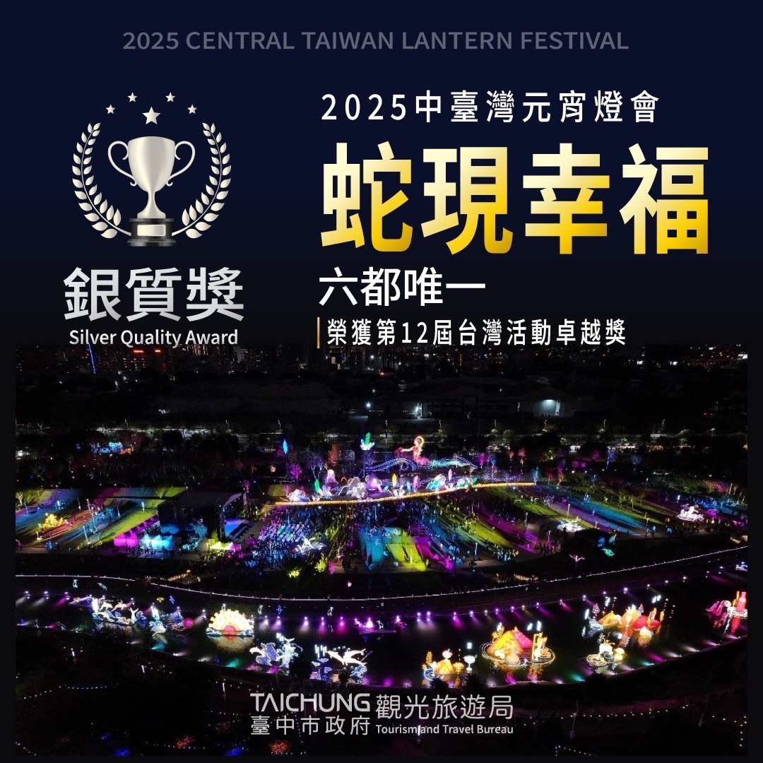 第十二屆台灣活動卓越獎於昨(4)日頒獎,台中市政府觀光旅遊局以「2025中台灣元宵燈會」提報公共服務獎類別,經與歷屆送件單位最多、達百場活動激烈競逐,最終自入圍決選15個單位中脫穎而出,不僅是「全台唯一」獲獎之燈會,更是「六都唯一、西台灣唯一」獲獎之公共服務活動,繼勇奪13項國際設計大獎之後,再獲國內指標性獎項之肯定!
