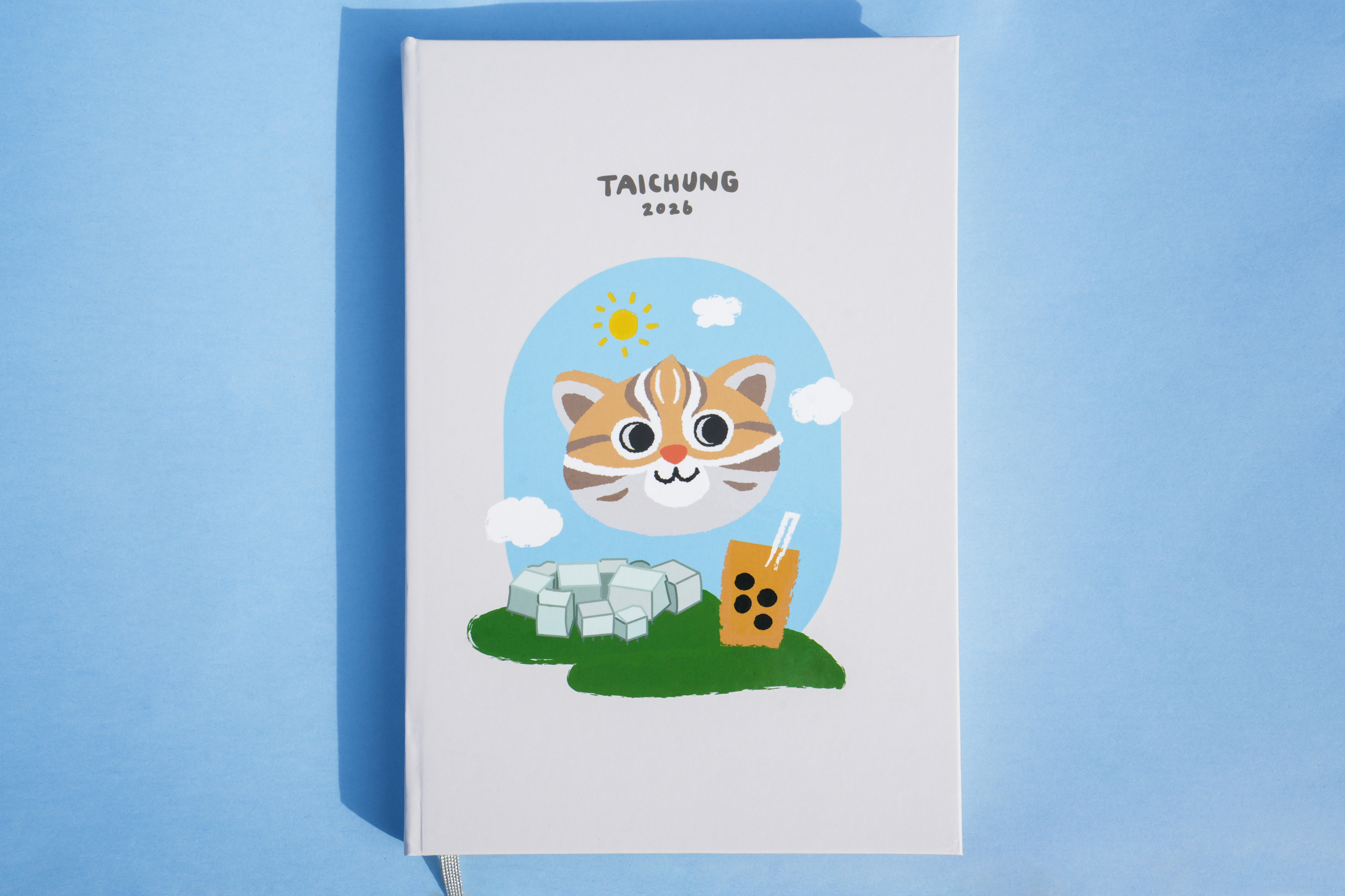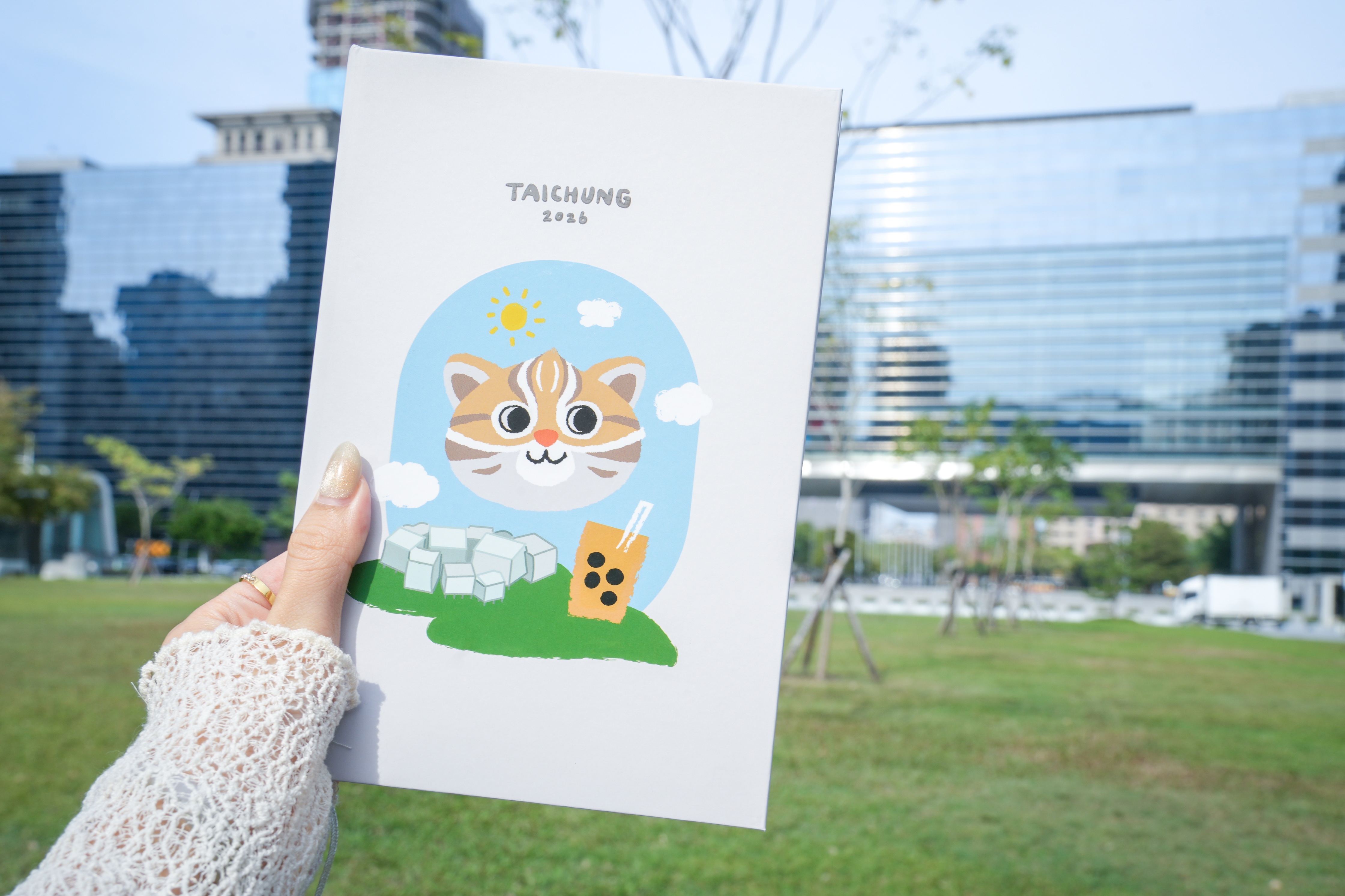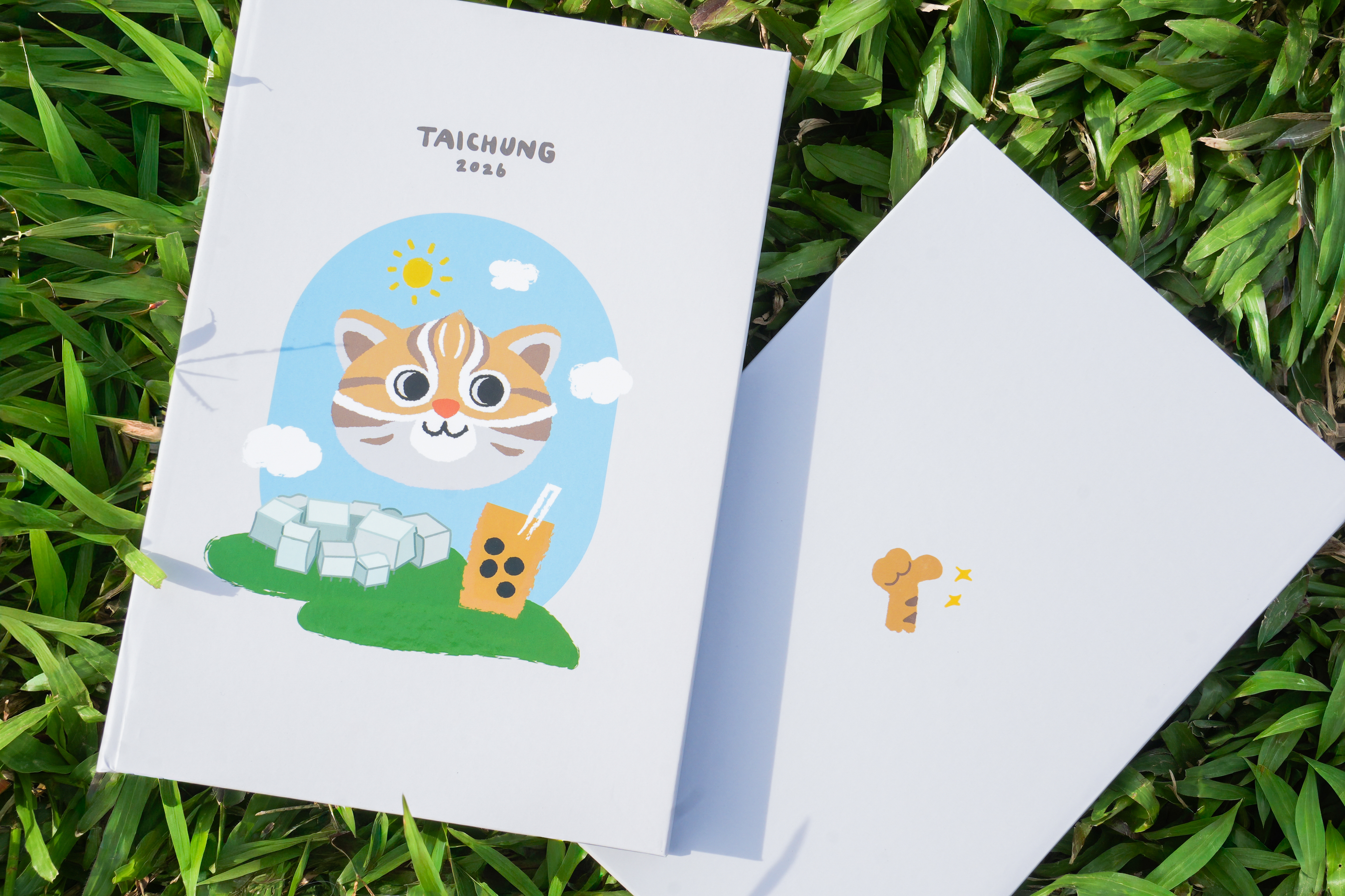 每年都讓粉絲敲碗期待的《2026記事手札》亮相囉!2026年的手札以「石虎家族」作為封面主角,結合台中全新藝文地標「台中綠美圖」,以溫柔的淺灰色打底,帶著一點文青氣息。插畫手繪風的「來虎」,搭配象徵台中好甜的珍奶元素,整本手札散發濃濃台中味。俏皮又充滿童趣的設計,把在地特色一次收好收滿。翻到封底還有驚喜,石虎的大姆指比出大大的讚,象徵台中市政在2026年繼續為市民帶來滿滿幸福感。