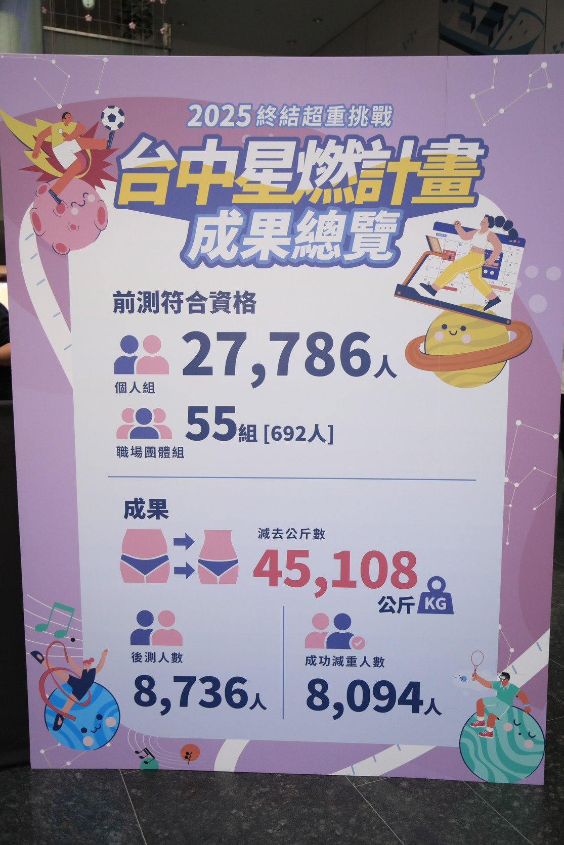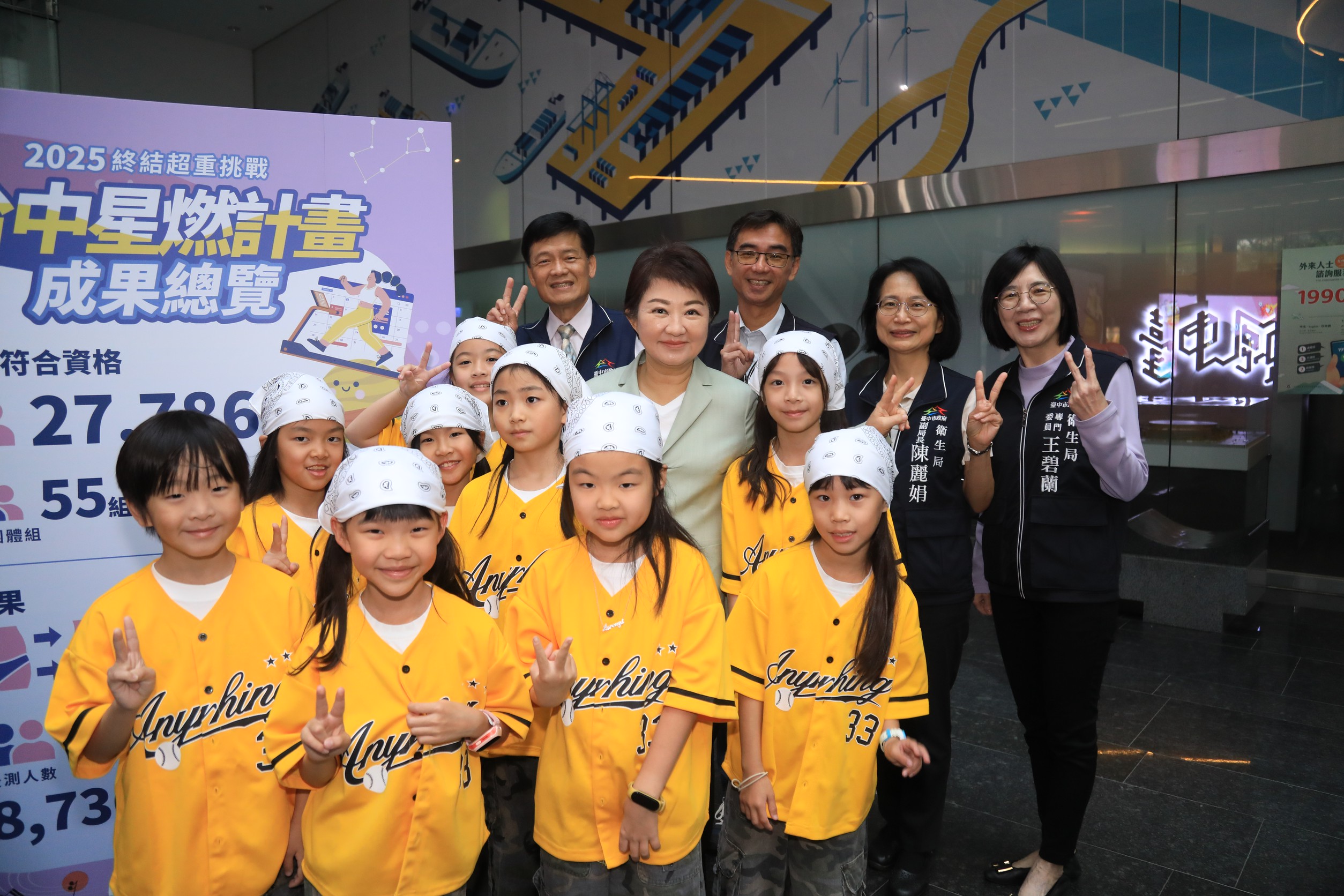 台中市政府衛生局今(5)日舉辦「2025台中星燃計畫:終結超重挑戰」成果表揚記者會,宣布為期三個月的大型健康競賽圓滿落幕。市長盧秀燕出席嘉勉表示,星燃計畫源自她看見許多市民努力減肥卻常覺得孤單,因此市府推出專業陪伴與科學方法,邀請大家一起變健康。活動共吸引27,786人報名,等於每100位市民就有1位響應,最終超過8,000人成功達標,累計甩肉4.5萬公斤,展現市民追求健康的驚人行動力。