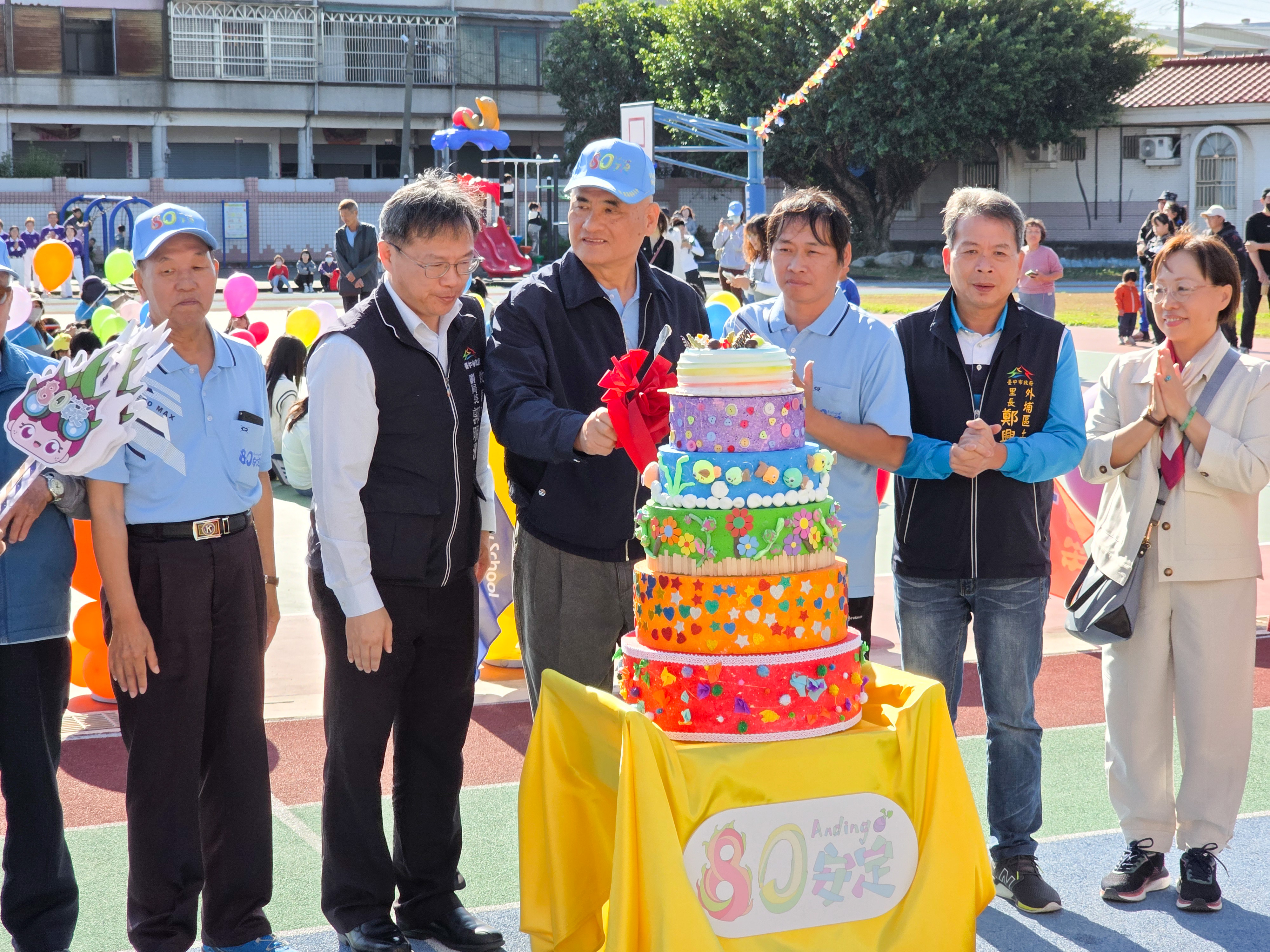 台中市外埔區安定國小創校80週年校慶今(6)日熱鬧登場,教育局副局長郭明洲到場祝賀,與全校師生共切幼兒園精心準備的生日蛋糕,歡慶80週年校慶。