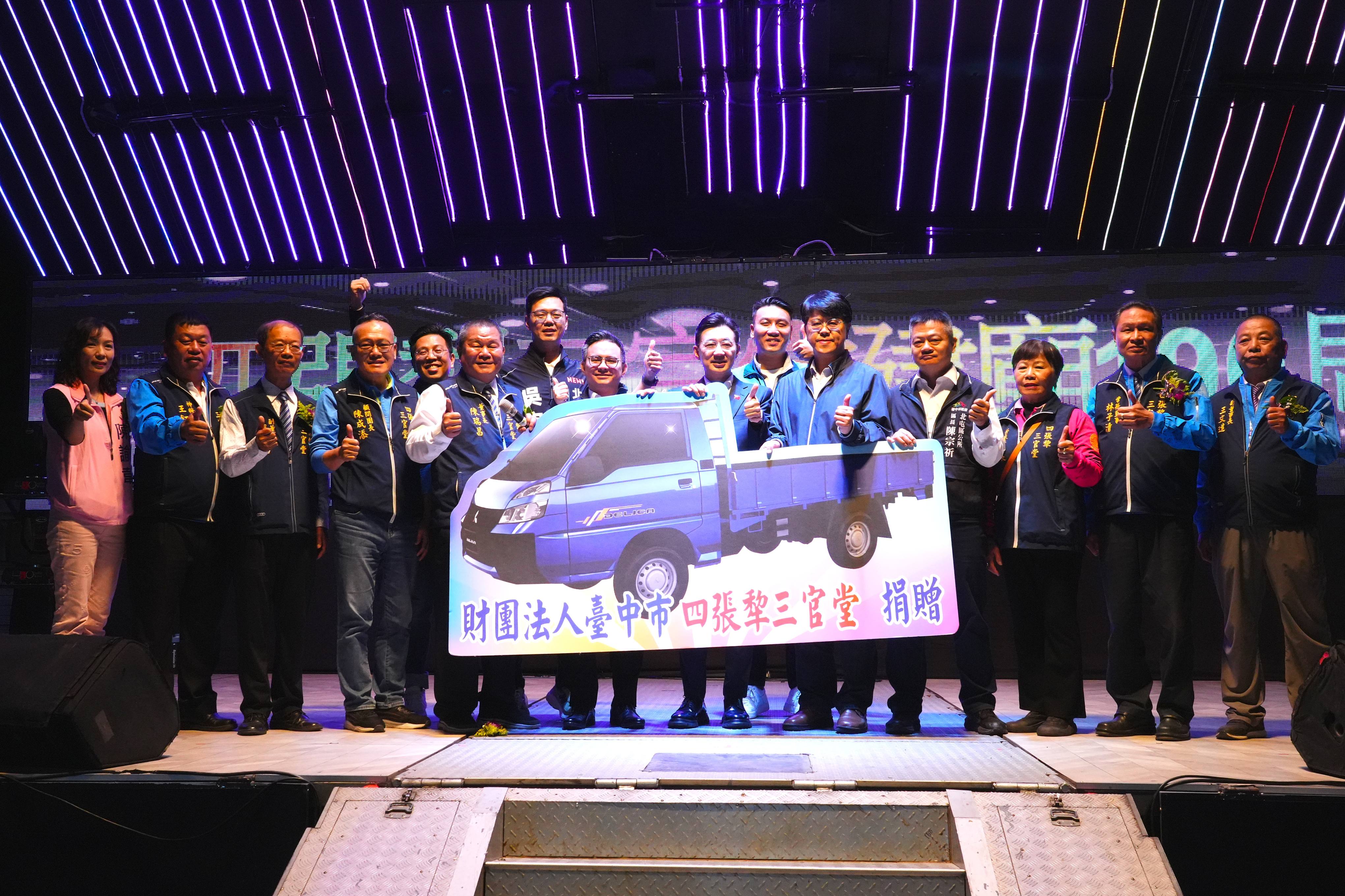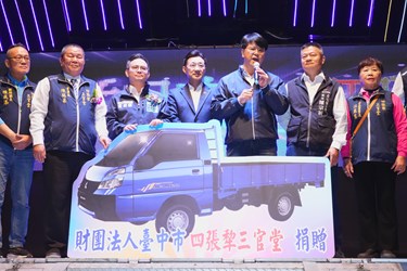 彭副局長指出,四張犂三官堂歷史悠久,主祀三官大帝,是當地重要的信仰中心,長期深耕在地文化、公益服務及社會關懷,並多次獲市府「績優宗教團體」肯定,展現其在宗教文化推廣與社會公益上的重要影響力。今年適逢建廟190周年,廟方除精心籌劃系列慶典外,也特別捐贈北屯區公所一台公務貨車,協助提升地方行政與社區服務效能,感謝董事長陳瑞昌帶領團隊,讓宗教力量成為地方的溫暖後盾,並祝福在三官大帝庇佑下,市民平安健康、台中和順安泰。