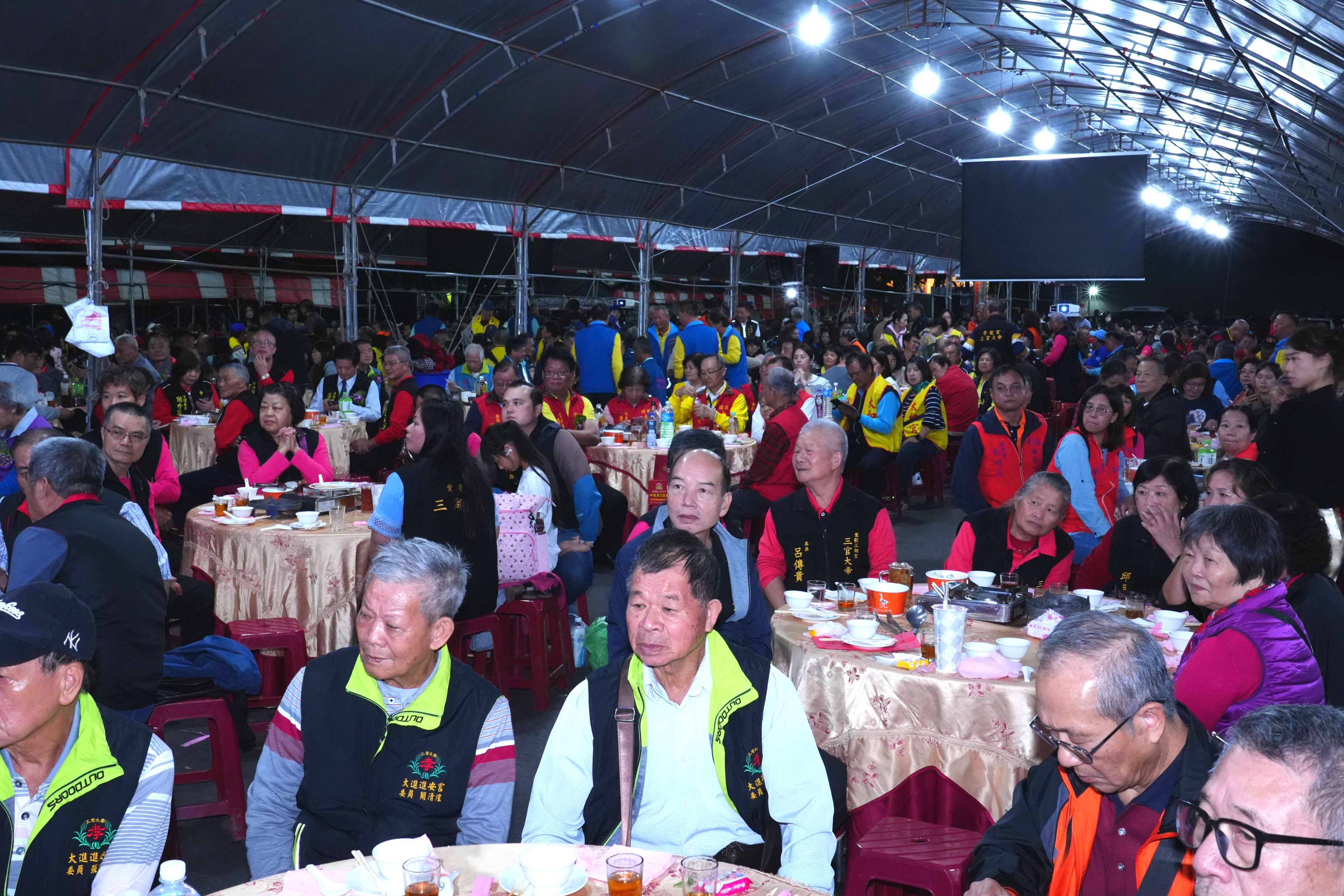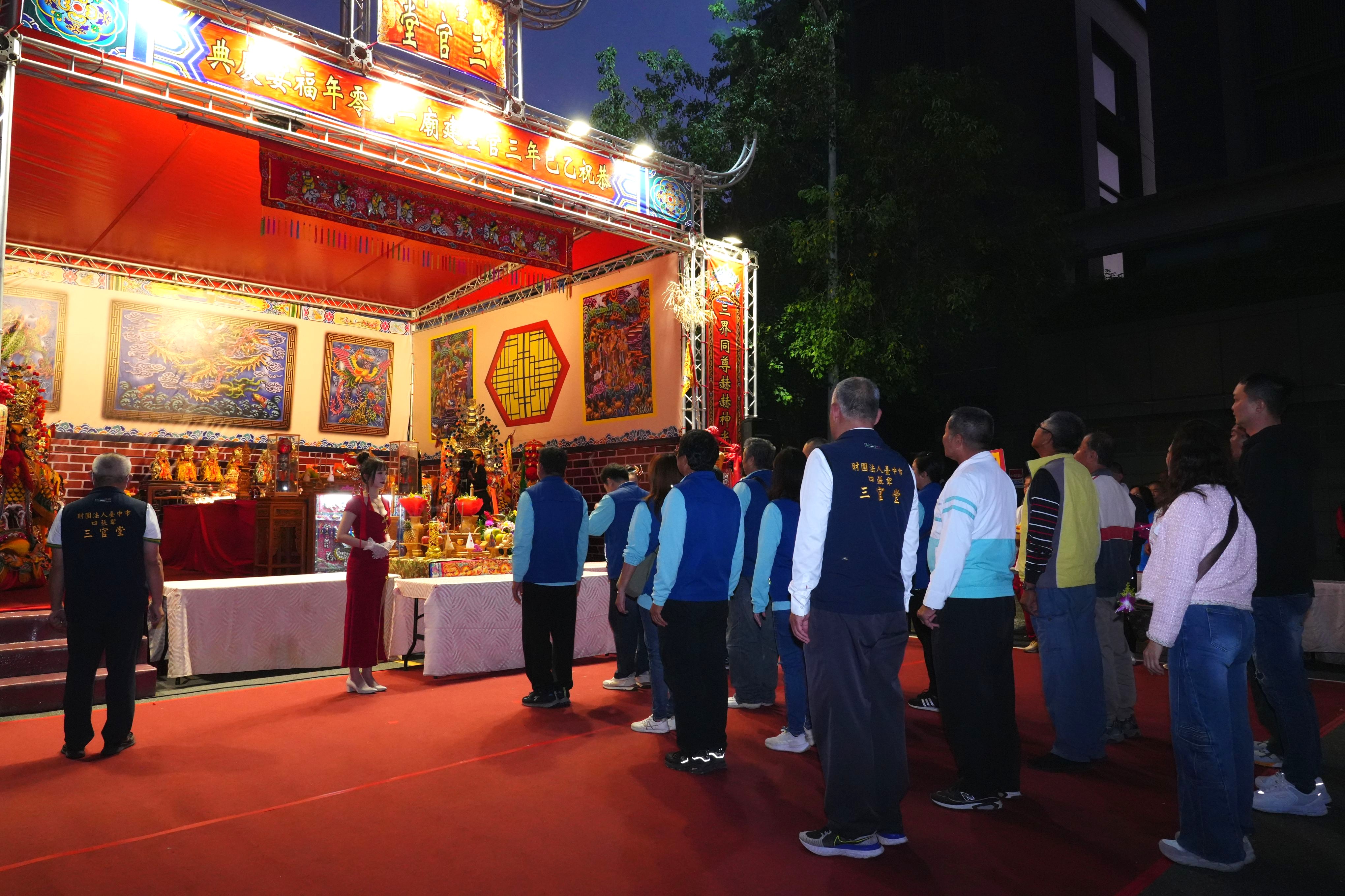 財團法人台中市四張犂三官堂為慶祝建廟190周年暨啟建環保金爐落成啟用,廟方自124日起舉辦為期三天的慶典科儀籌謝神恩,並於昨(6)晚舉行福宴與各友宮及信眾共享喜悅,現場席開270桌,場面盛大熱鬧。民政局副局長彭岑凱代表市長盧秀燕出席同慶,感謝廟方慈悲濟世,長年護佑鄉里,為地方帶來安定力量,並祝福四張犂三官堂神威顯赫、香火永傳。
