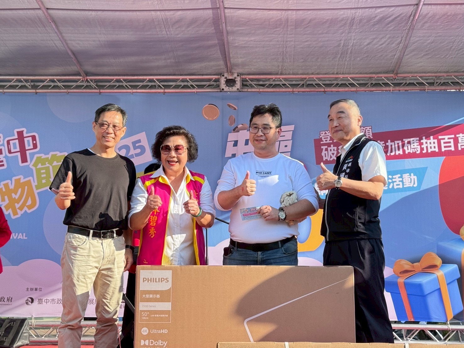 台中購物節起跑第7週,累計登錄金額截至昨(6)日已達239億元,今日市府在大里公園舉辦「2025台中購物節-屯區GOGO購」活動,歡慶登錄金額突破200億元,現場由副市長黃國榮抽出百萬現金1名,同場也抽出外籍專屬美金1萬元、天天抽3千元現金等豐富獎項。