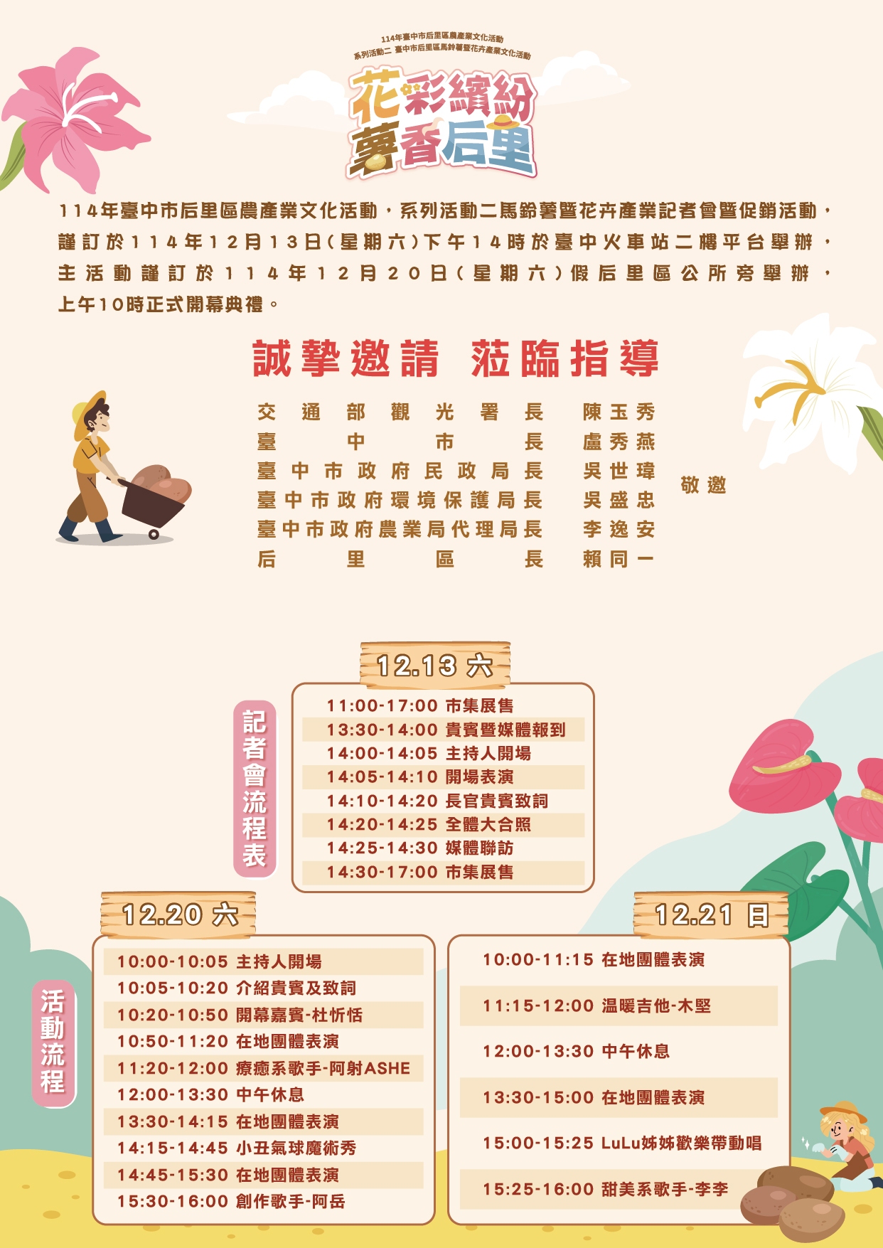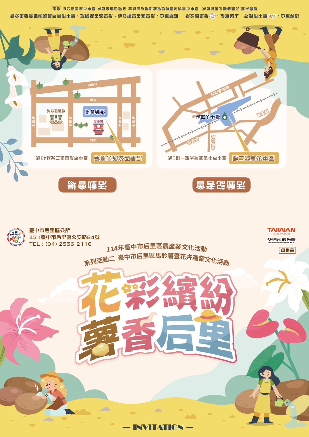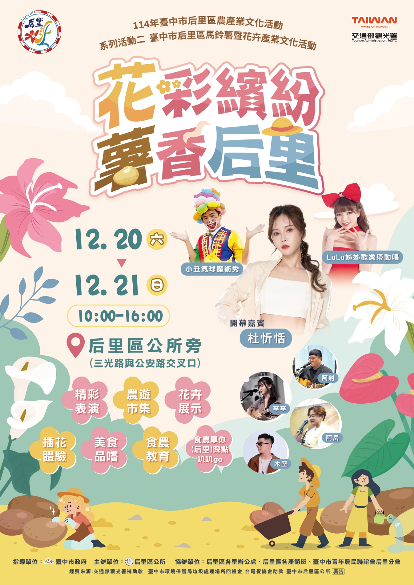 為提升地方農特產業,結合在地青農領航的食農教育體驗以整合地方農業、文化、觀光等產業資源;以季節性農特產品馬鈴薯及花卉為主題,結合后里觀光休閒,帶動地方農村休閒旅遊事業,繁榮地方經濟,提升農業經濟價值。