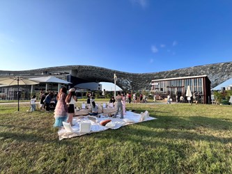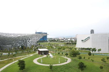 建設局長陳大田說明,Funkyland座落中央公園味覺體驗區草坡制高點,是綠美圖與會展中心間最醒目的視覺焦點。從空中花園、會展中心二樓平台、經貿五路跨橋甚至舊機場跑道草坪遠眺,都能看見其獨特造型,宛如嵌在自然中的現代藝術地景。業者善用地形層次打造舒適開放的休憩空間,提供咖啡輕食、風格野餐預約與主題課程,讓遊客在自然景觀中享受慢活時光。