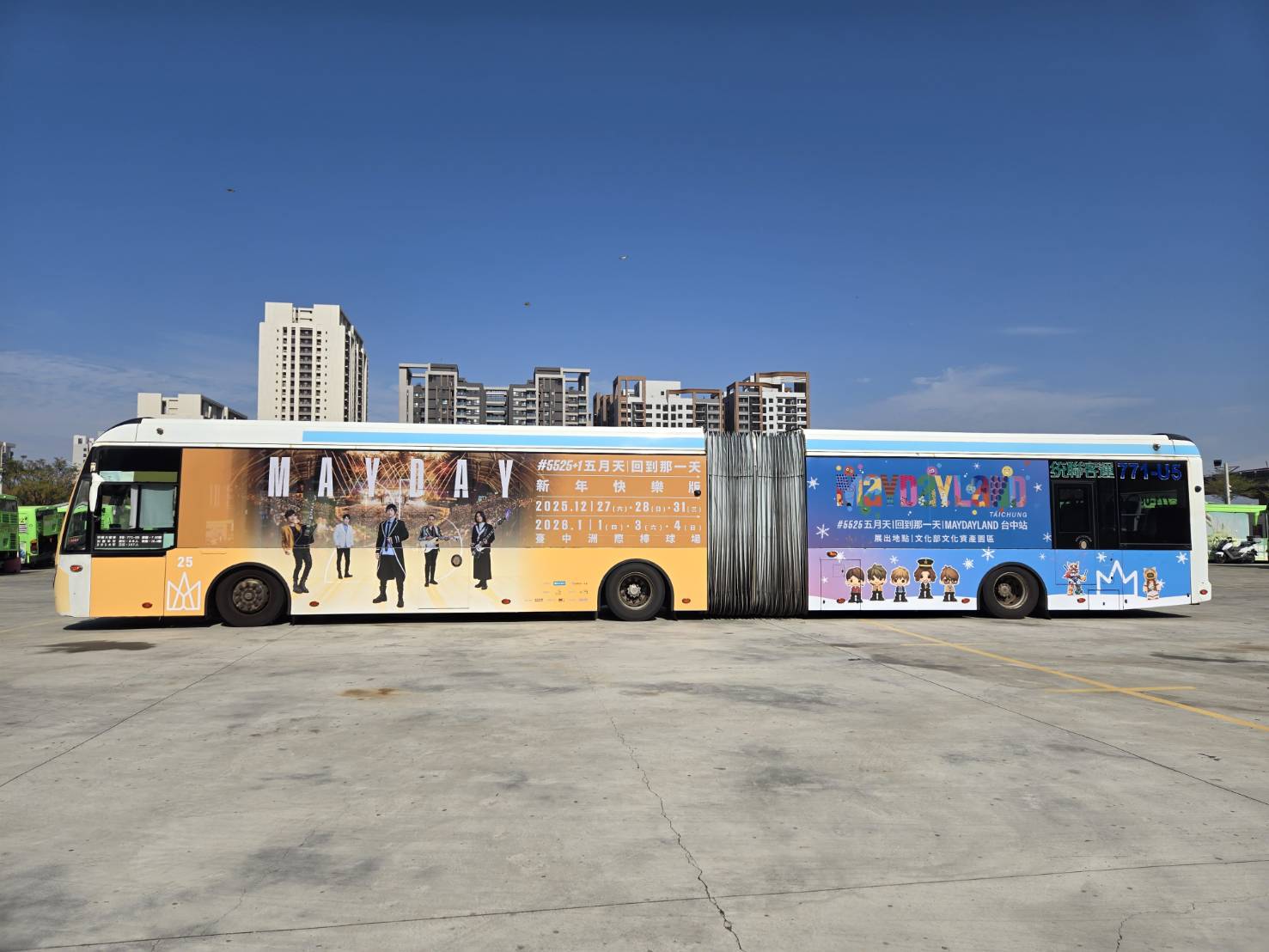 此外,「MAYDAYLAND in Taichung」特展將於今年12月19日至明年1月4日在台中文化資產園區登場,以沉浸式方式呈現五月天的經典記憶。另,還有14條市區公車路線換上主題彩繪,化身為「MAYDAYLAND 公車」,分布於台灣大道、台中車站、台中公園、崇德路、文心路與高鐵台中站等主要動線,包含 3、25、52、56、59、61、77、81、105、241、301、303、308、700 路;而 300、309、310 等雙節公車也同步換上主題視覺。民眾在走訪限定場景之餘,也可利用大眾運輸穿梭市區,途中不時有機會巧遇MAYDAYLAND公車,捕捉屬於台中的驚喜瞬間。