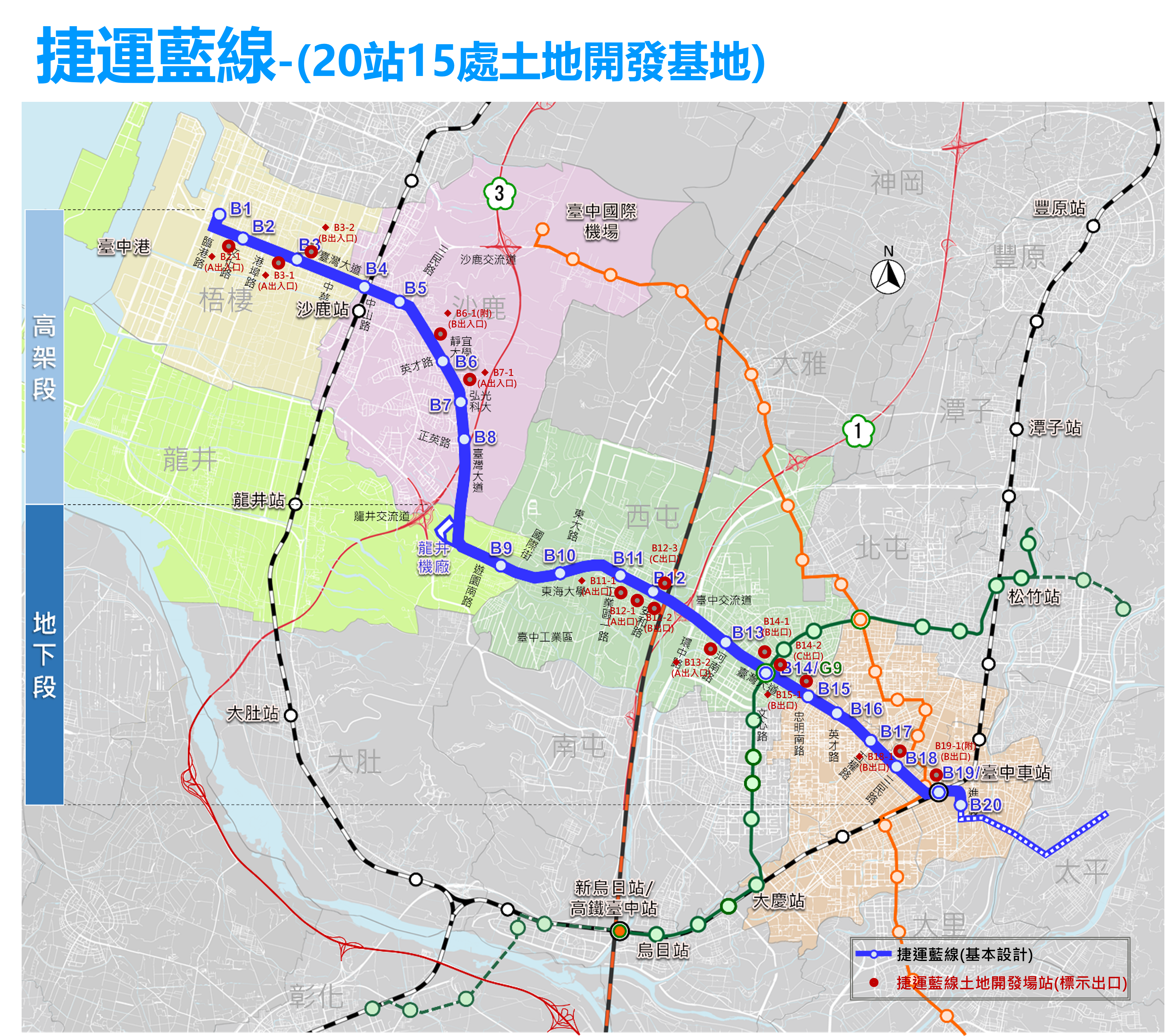台中捷運藍線於今年6月整體開工,率先啟動龍井機廠工程。隨著土建細部設計陸續完成,藍線路段可望明年進場施工。龍井機廠用地取得已近全數到位,全線規劃15處土地開發基地。台中市政府捷運工程局表示,藍線啟動將串聯市區、海線與產業節點,帶動帶狀發展,邁向更便捷的一日生活圈。