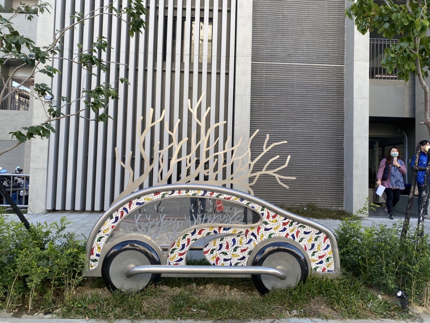 沙鹿沙田立體停車場藝術車款超吸睛,以不鏽鋼與馬賽克拼出繽紛車體。_0