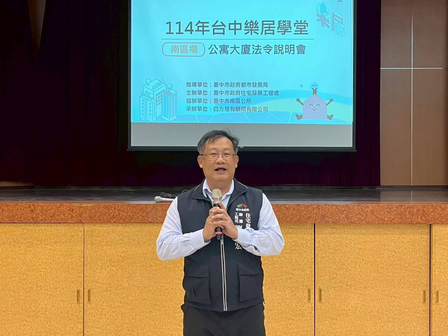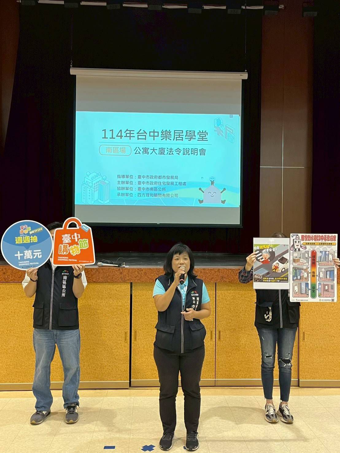 台中市政府都市發展局住宅發展工程處於今(13)日在南區區公所舉辦今年度第6場次「台中樂居學堂(公寓大廈法令說明會)」,由住宅處及南區區公所共同舉辦,住宅處副總工程司劉政宏及南區區公所區長李美麗一同出席,議員李中、鄭功進、林霈涵等均派代表蒞臨,社區管理組織、住戶及管理服務人員等報名踴躍,百人收穫滿滿。
