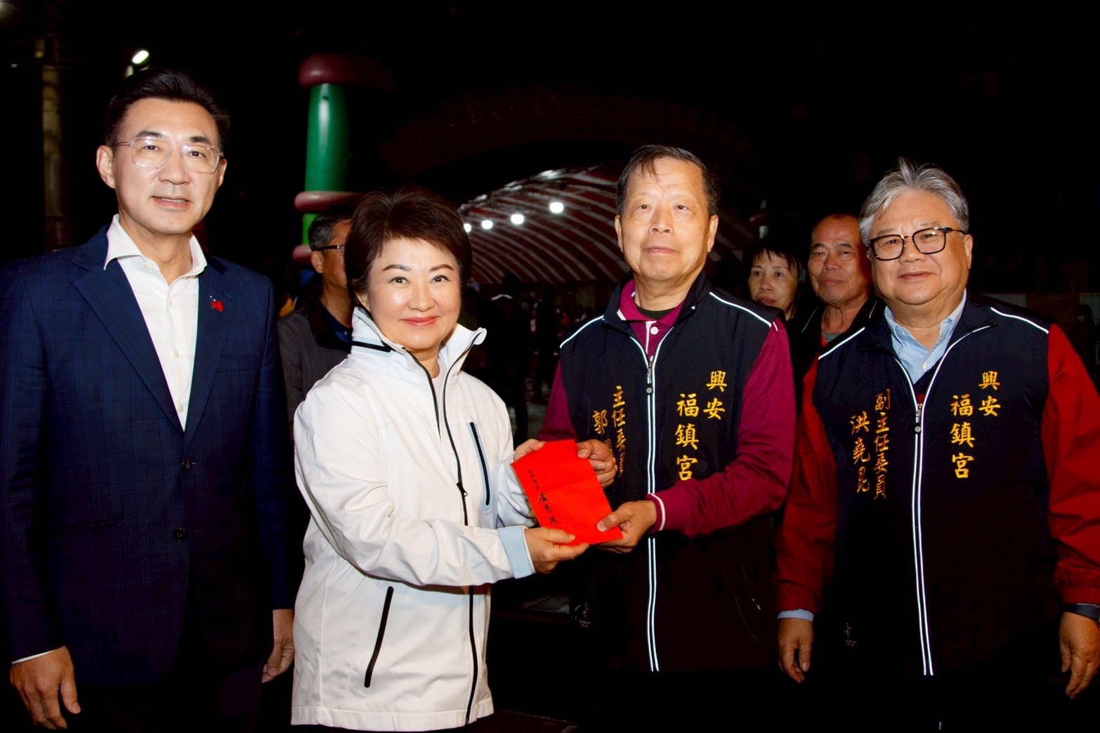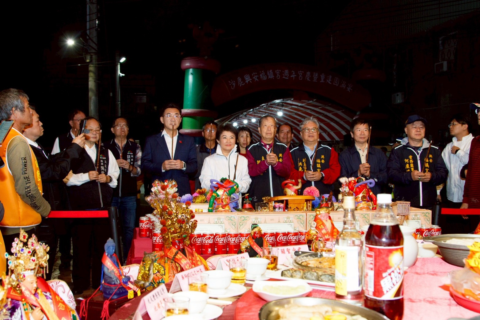 台中市沙鹿區興安福鎮宮(原興安福德祠)創建於民國30年,因緊臨沙鹿、梧棲往來主要幹道旁,車流頻繁影響交通安全且廟地不足,廟方於107年決議蓋新廟,新廟於去年12月落成。今(13)晚舉行重建週年圓滿宴,市長盧秀燕前往參拜祈福,並致贈「福德萬民」匾額,感謝廟方長年對地方的貢獻,也祈求福德正神庇佑市政昌隆、市民平安健康。