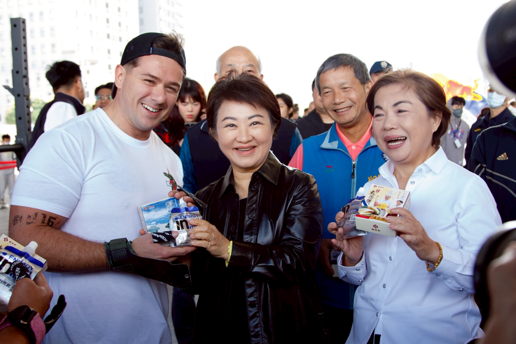 今日盧市長親臨賽事現場,體驗風扇車及壺鈴等運動器材,並邀請立法院副院長江啟臣等人一同體驗,同時也前往暖身區與選手近距離互動,向來自各國的頂尖選手致意,送上市府準備的「能量補給品」,祝福選手保持最佳狀態、全力應戰,同時也幫跨界挑戰的明星藝人逐一打氣,鼓勵他們展現跨領域的運動精神。