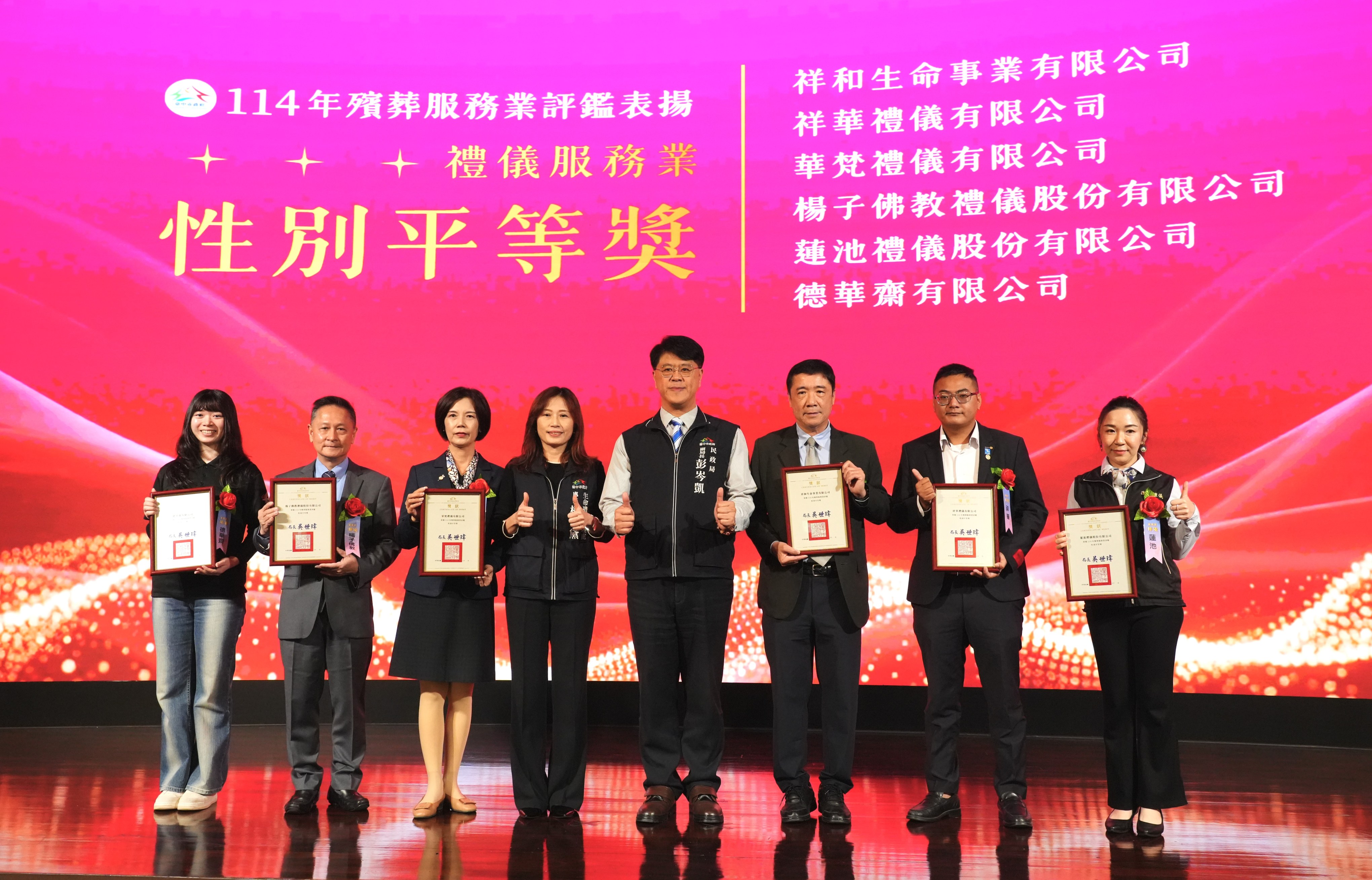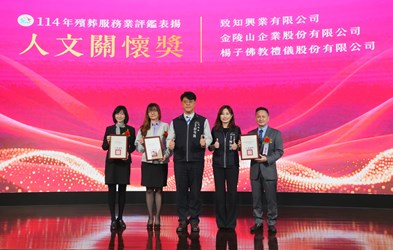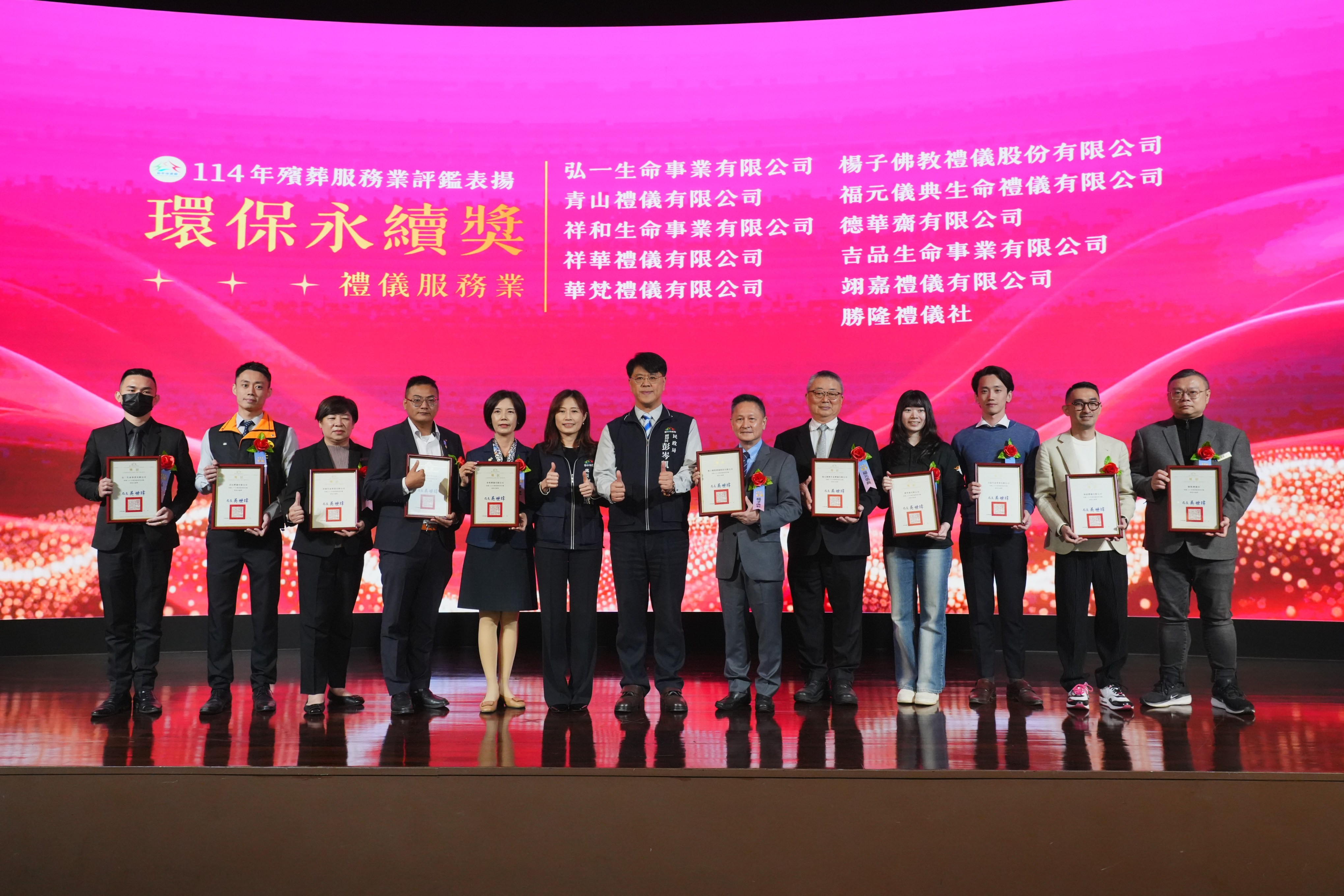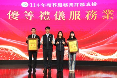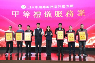 生管處長柯宏黛提到,今年評鑑中可見多數業者積極接軌國際ESG(環境、社會、治理)發展趨勢,不僅在喪葬儀節中落實性別平權理念,如女兒捧斗、女性封釘等作法,也推動以米代金等環保節葬措施,並結合科技創新服務,展現兼顧人文關懷與永續發展的專業精神。此次特殊榮譽獎項中,共有10家業者獲頒性別平等獎、16家環保永續獎、5家創新服務獎及3家人文關懷獎,充分展現殯葬業多元且具前瞻性的發展成果。