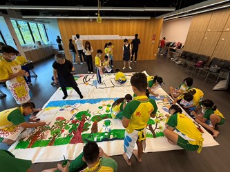 活動的尾聲則是全員共同參與大型作品創作,學生們需在指定主題下分工協作,運用水彩、蠟筆或黏土等多元媒材,一步步將構想具體化。在討論構圖、協調色彩、輪流動手的過程中,學生們彼此鼓勵、相互協助,不僅激發創造力,也培養溝通能力與團隊精神。作品完成後,大家圍坐一起欣賞成果,並由巫老師逐一分享作品中的亮點,引導學生觀察彼此的想像力與創意來源,現場氣氛充滿溫馨與成就感。(12/16*10)*教育局