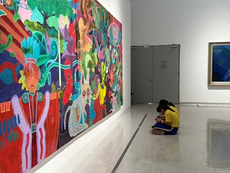 許多孩子是首次踏入大型美術館,在寬敞的展廳中欣賞作品時,既驚喜又新奇,對眼前的色彩與構圖充滿好奇,作品導覽課程結束後,學生們開始進行個別創作練習,巫老師鼓勵大家挑選自己喜歡的作品,運用鉛筆進行臨摹創作,學生們在動筆的過程中體會創作的妙趣,並用屬於自己的方式表達感受。過程中特教生與普通生能夠互相協助、分享經驗,雙方在互動中逐漸建立起信任與默契。