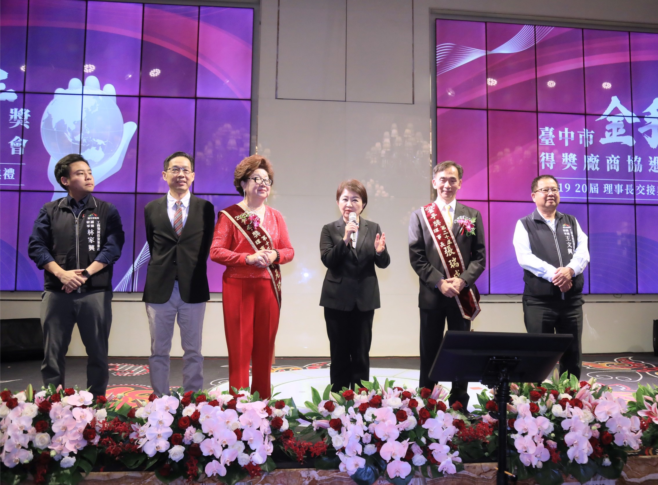 台中市金手獎得獎廠商協進會今(17)晚舉行第19、20屆新卸任理事長交接典禮,由現任理事長郭元瑾交接給新任理事長張瑞成。市長盧秀燕出席祝賀表示,金手獎協會雖為地方性經濟團體,卻是全國最具代表性的企業領袖組織,唯有獲得台中市金手獎肯定的企業家,才具有入會資格;而金手獎歷經嚴格評選、門檻極高,得主皆為拚經濟,具高度競爭力的成功企業家,感謝為台中、台灣貢獻良多。