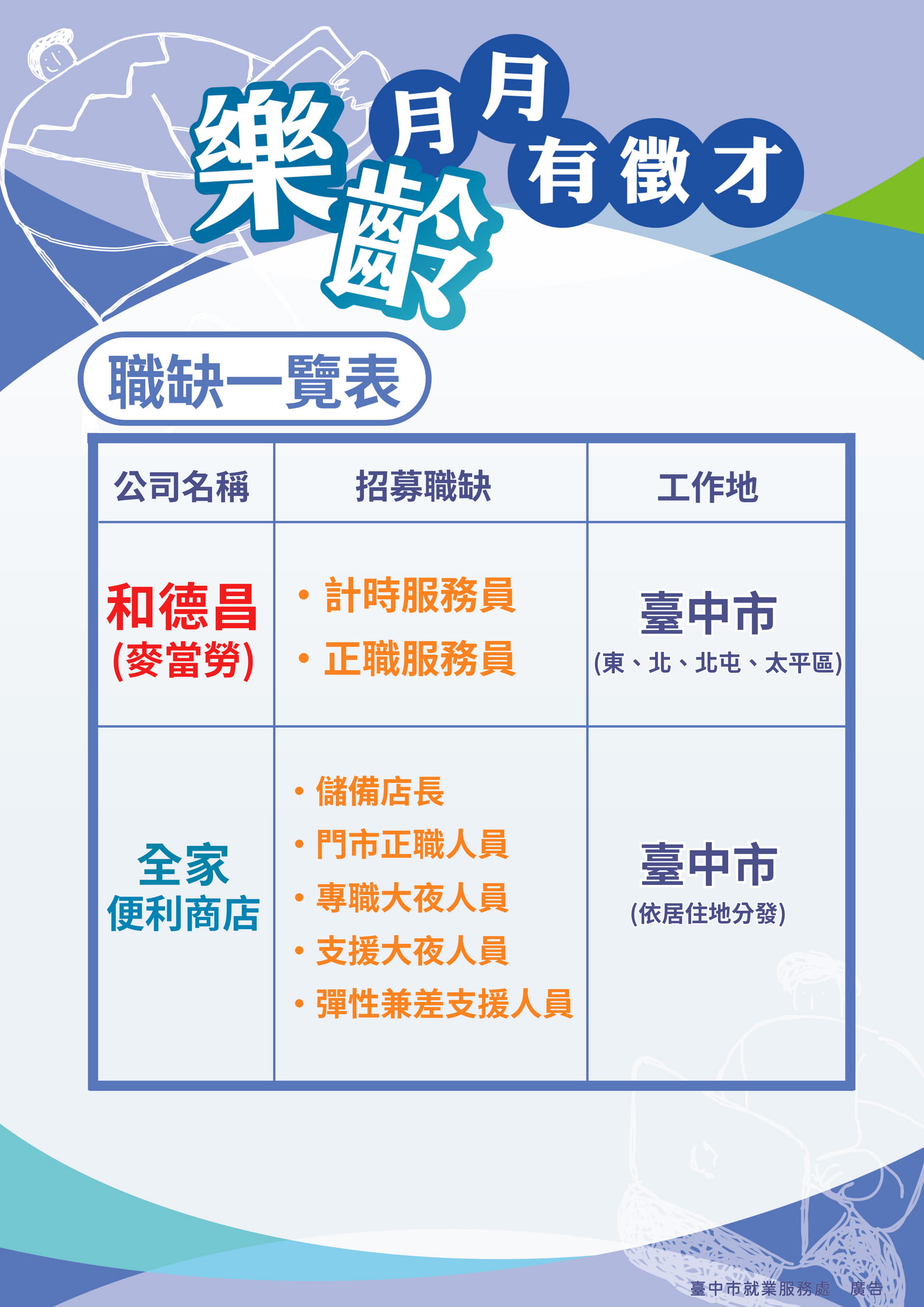 ◇臺中市就業服務處《臺中就業服務站/各就業服務台》提供免費求職求才服務,歡迎有需求民眾就近洽詢。 |