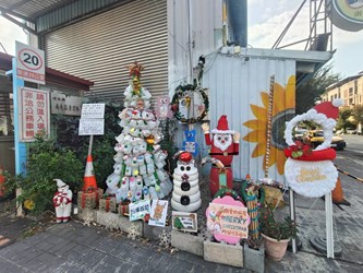 南屯區清潔隊長陳秀玲表示,這座環保聖誕樹的主體結構巧妙運用回收的呼拉圈、竹子與綠色回收網袋搭建而成,勾勒出聖誕樹的輪廓;樹上的「葉片」則由約200個清洗乾淨的回收牛奶瓶加工製成,搭配回收裝飾品與燈飾,在夜間燈光映照下呈現晶瑩剔透的效果,賦予廢棄物嶄新的生命。此外,聖誕樹旁還佇立著以2個廚餘桶打造的聖誕老公公、由5個廢輪胎與2個喇叭組合而成的小雪人,以及利用200多支吸管與3個紙筒製作的大型拐杖糖模型,處處展現資源再利用的巧思與創意。