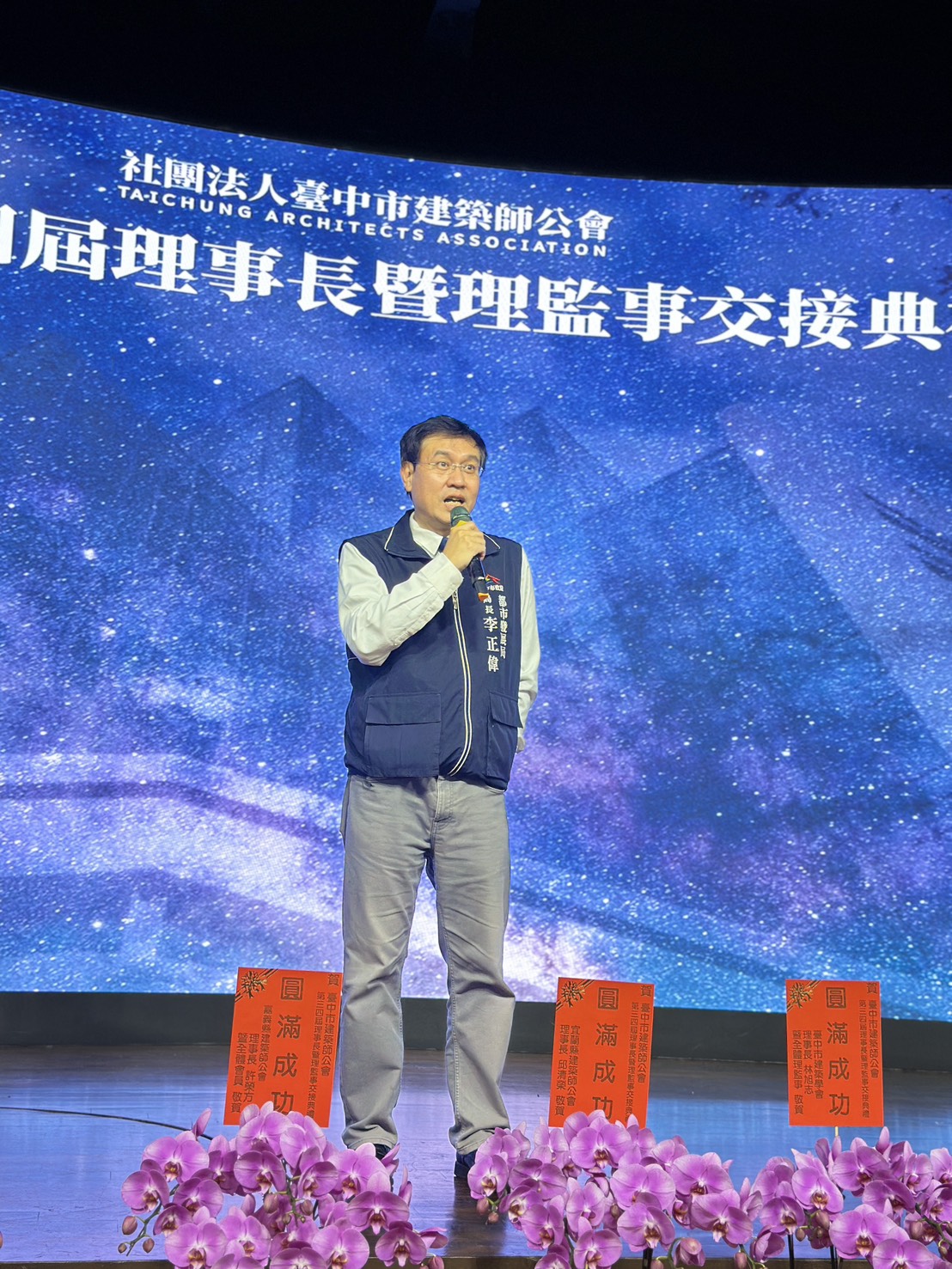李局長表示,建築師是形塑城市風貌與提升生活品質的重要力量,台中市近年朝向「宜居、永續、韌性」城市願景前進,無論在建築美學、工程品質或公共空間營造上,皆有賴建築師的專業投入與公私協力。他特別感謝虞承宗名譽理事長及第三屆理監事團隊,任內與市府密切合作,完成多項制度精進與程序簡化,包括都市設計審議、危老及都市更新案件分流與分級審查,使台中在危老推動成果上名列全國前茅,展現專業與公私協力的具體成效。
