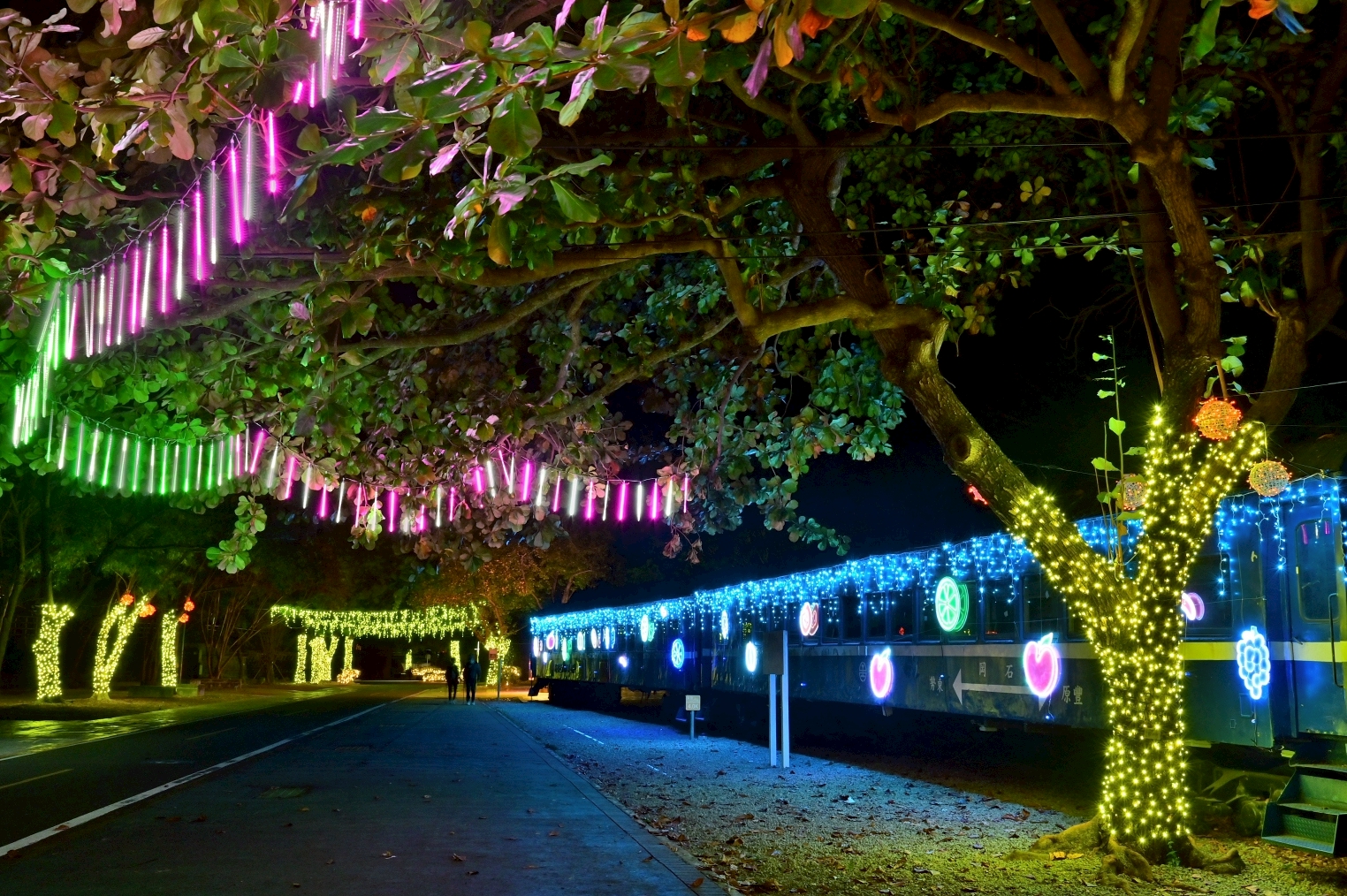 此外,「果鄉漫遊」燈區以復古遊戲場景為靈感,打造趣味十足的拉霸機裝置,並設置滿載葡萄、柑橘與柚子的「石岡號」,呼應藍皮火車上的鮮果燈飾,展現山城農產的甜美生命力;石岡橋則化身為「橙香光橋」,暖橘與藍綠燈色如霧光流動,並延伸至區公所前方光影長廊,營造浪漫夜景;和盛公園「繽紛蝶境」以蝴蝶、生態與森林為主題,綠光與幻紫光交錯,宛如走進會呼吸的光影森林,靜謐而迷人。