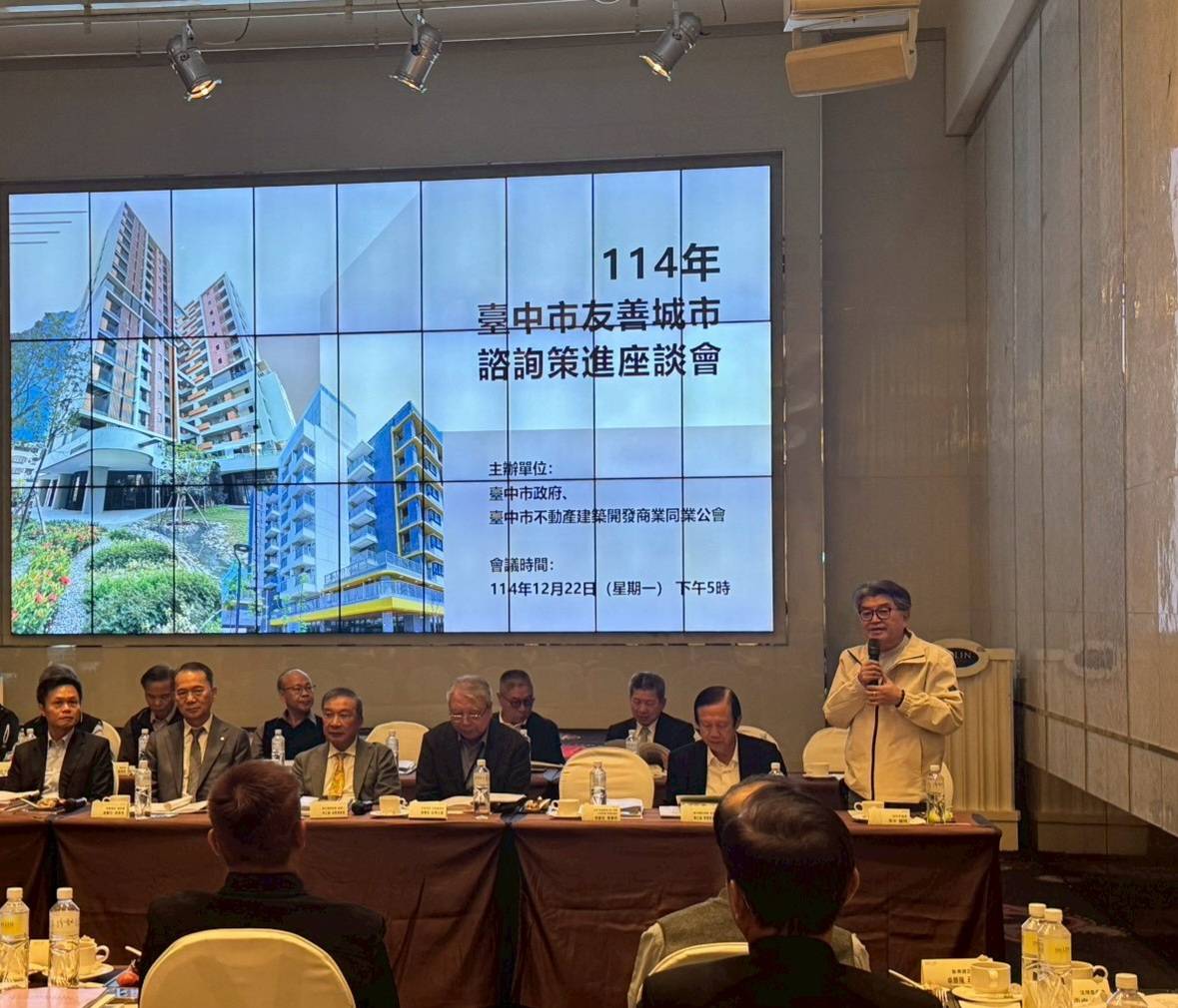 台中市政府昨(22)日攜手台中市不動產建築開發商業同業公會,共同舉辦「114年台中市友善城市諮詢策進座談會」,由市府副秘書長林育鴻代表市長盧秀燕,率領市府團隊與產業界代表進行面對面交流,廣納各界建言,深化公私協力。