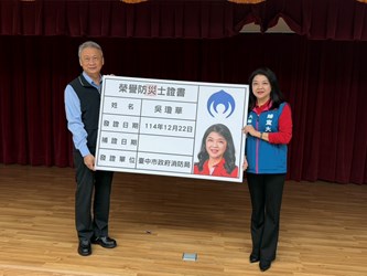 值得一提的是,吳大隊長也因長年投入防災工作,深獲市民肯定,榮獲「榮譽防災士」殊榮名副其實;她表示,希望以自身經驗拋磚引玉,鼓勵更多女性投入志工服務,一同讓台中的防災網更緊密、更有溫度。