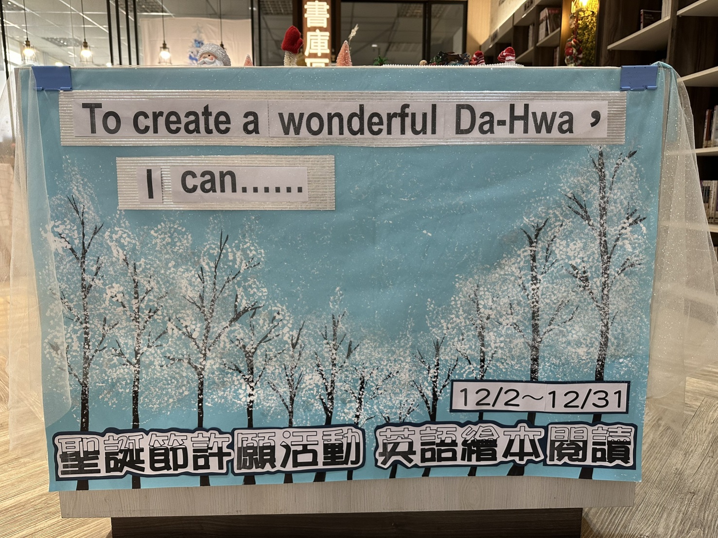 豐南國中則規劃交換祝福卡、「找找薑餅人」及「100%實現的願望」有獎徵答,引導學生把願望化為可實踐的目標;大華國中辦理「Frozen Christmas 許願+國際英文繪本展」,結合英文繪本、聖誕闖關與許願行動,讓閱讀成為自我成長與彼此鼓勵的力量,也為新的一年點亮希望。