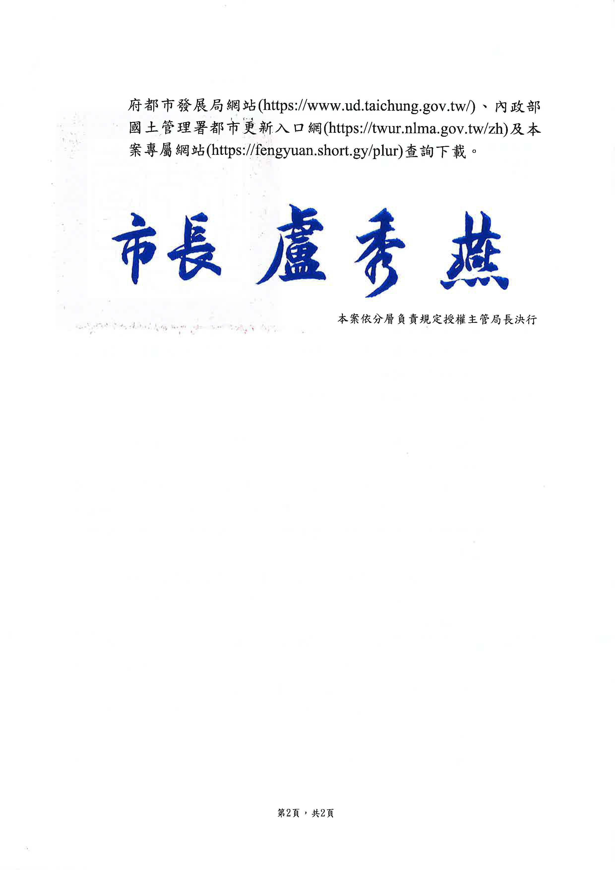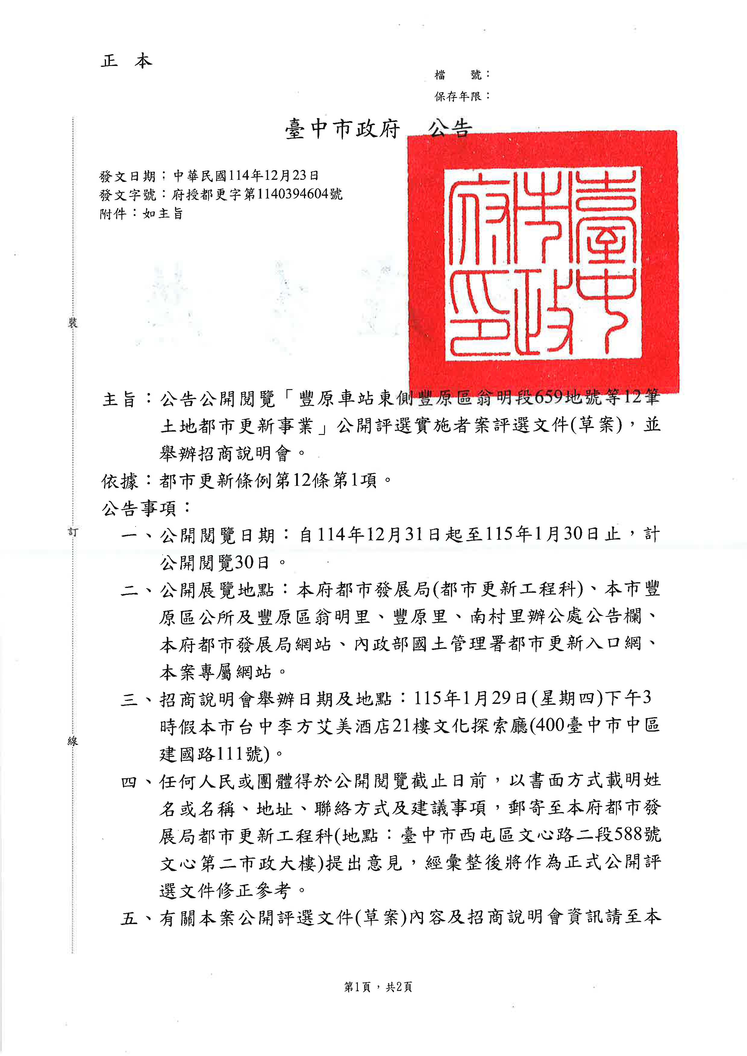 有關此案公開評選文件(草案)內容、公開閱覽及招商說明會資訊請參閱公告,或至市府都市發展局網站(網址:https://www.ud.taichung.gov.tw/)、內政部國土管理署都市更新入口網(網址:https://twur.nlma.gov.tw/zh)及此案專屬網站(網址:https://fengyuan.short.gy/plur)查詢。市府將持續精進後續各項作業,誠摯邀請有意參與都市更新事業的廠商踴躍投入,共同見證並參與豐原市容的華麗轉身,公私部門攜手共築共榮新未來。