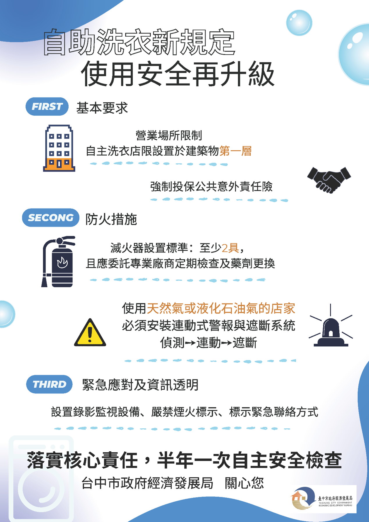 為強化自助洗衣店公共安全、讓民眾洗衣更安心,台中市政府自12月24日起正式實施《台中市自助洗衣店安全管理自治條例》,從「場所、設備、保險、檢查、罰則」五大面向建立完整管理機制,要求業者落實定期自主檢查,全面提升營業場所安全水準。此自治條例已於今年12月獲行政院核定通過,明確規範營業場所樓層限制,並要求投保公共意外責任險及導入必要安全防護設備,進一步強化營運管理,為市民日常生活多加一道保障。