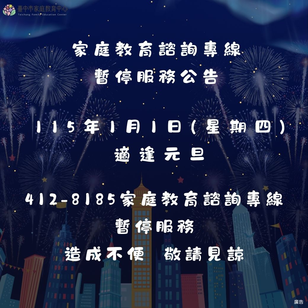 115年1月1日(星期四),共1日,適逢元旦,412-8185家庭教育諮詢專線暫停服務。