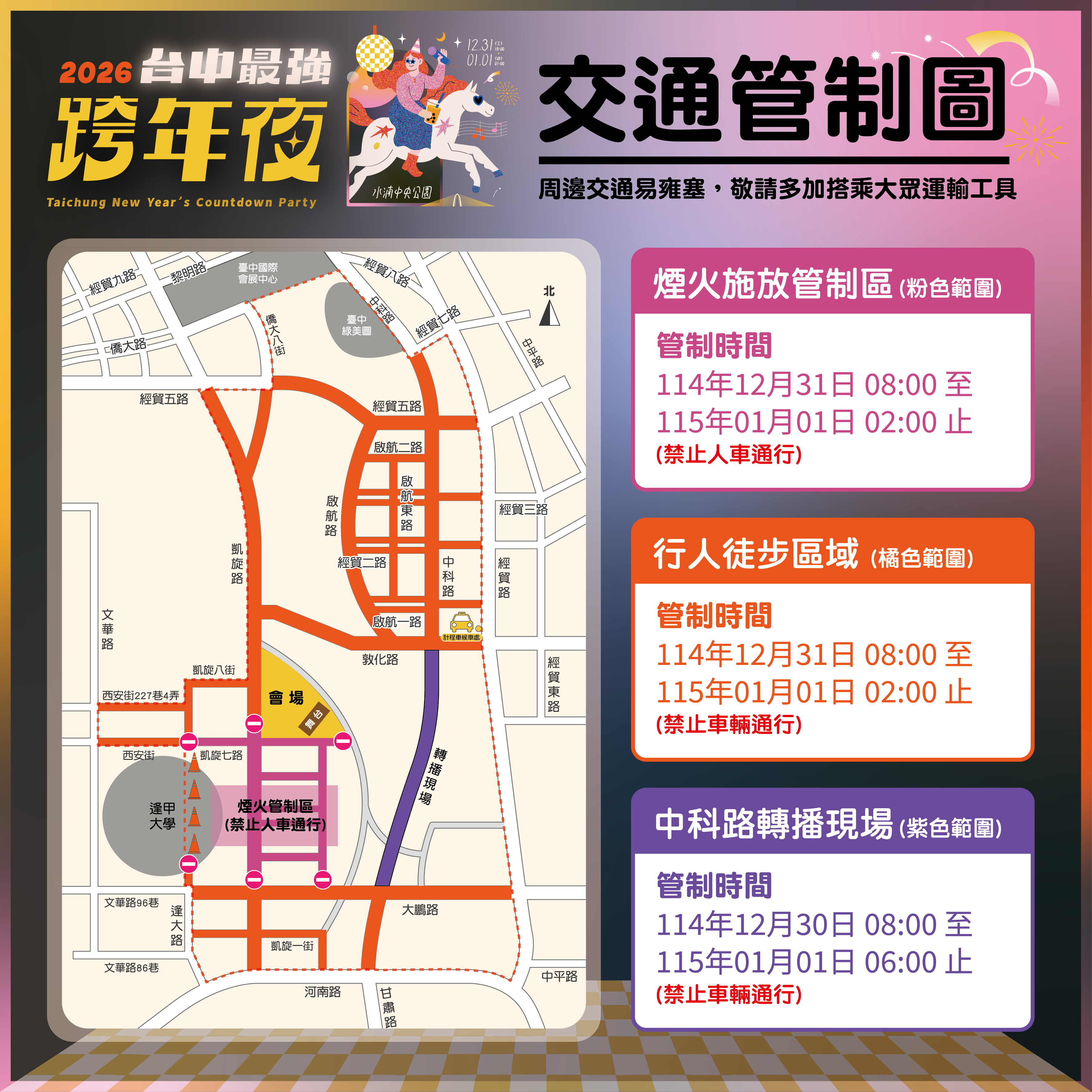 新聞局補充,活動會場南、北側及逢甲商圈周邊均設有汽、機車停車空間,並可搭配捷運沿線停車場使用,停車位有限,建議民眾出發前搜尋「台中跨年即時交通」,或掃描現場QR Code查詢剩餘車位資訊。交通局也協調公車業者加密班次並延後收班,包括333、23、82延、108、300、303、305、525及綠1等9條路線,詳細資訊可至台中公車即時動態資訊網站或APP查詢,並歡迎多加利用大眾運輸工具前往會場。