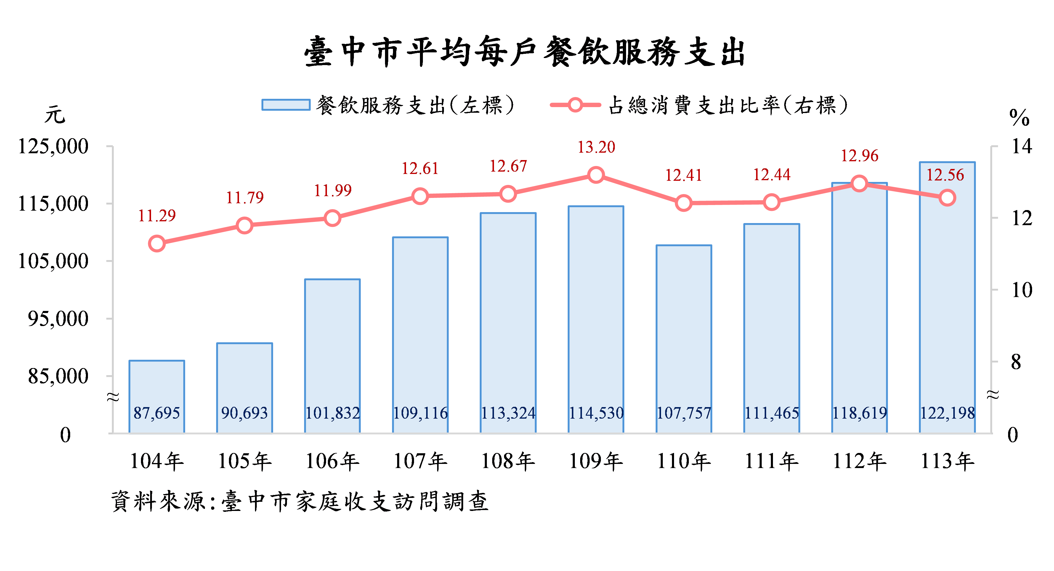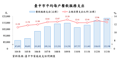 主計處表示,113年底台中市餐飲業營利事業家數達2.26萬家,較104年底增加47.55%。依家庭收支訪問調查結果,113年台中市平均每戶外食支出12.22萬元,較104年成長39.34%,占總消費支出比率達12.56%;近10年除疫情期間短暫下滑外,外食支出整體呈穩定上升趨勢。