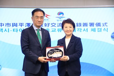 韓國京畿道平澤市長鄭長善從韓國遠道而來,今(7)日到訪台中拜會市長盧秀燕,雙方簽署友好交流備忘錄,盼深化兩市經貿、科技、教育、文化及觀光領域交流。鄭市長個人首次到訪台中,盛讚城市美麗景觀與整潔環境讓他印象深刻,更透露盧市長是韓國知名度最高的台灣市長,感佩她照顧市民就像媽媽一樣無微不至。盧市長也肯定鄭市長領導有方,強調此次簽署象徵台韓兩座科技重鎮開啟對話、共創共榮。