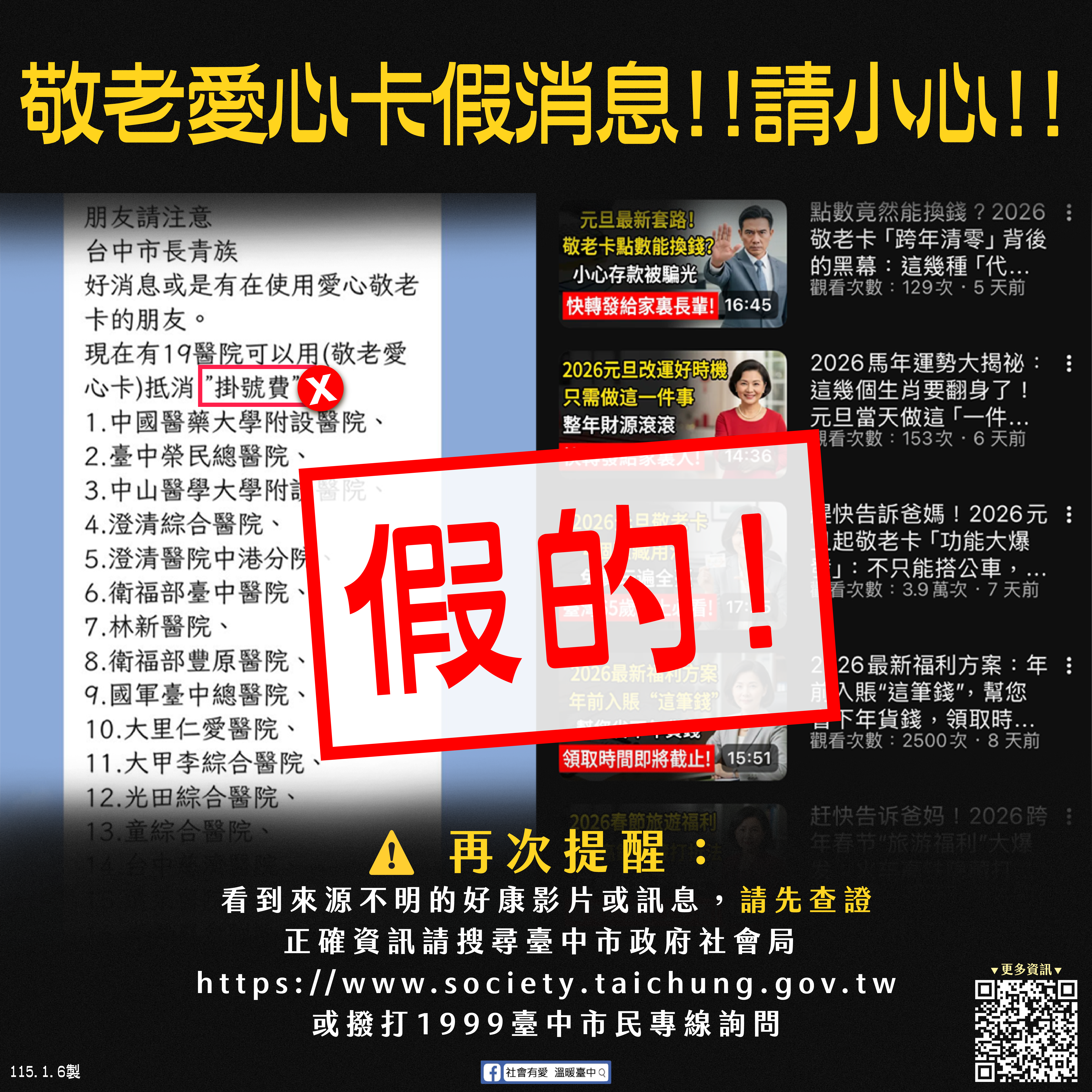 台中市政府特別提醒民眾,敬老愛心卡相關福利可查詢台中市政府社會局官網(https://www.society.taichung.gov.tw/),亦可撥打1999台中市民專線詢問。呼籲市民朋友協助澄清,傳遞正確訊息,共同防範AI假訊息擴散。