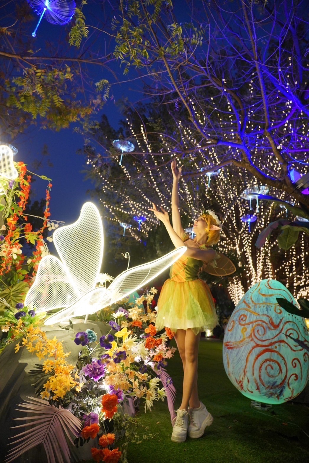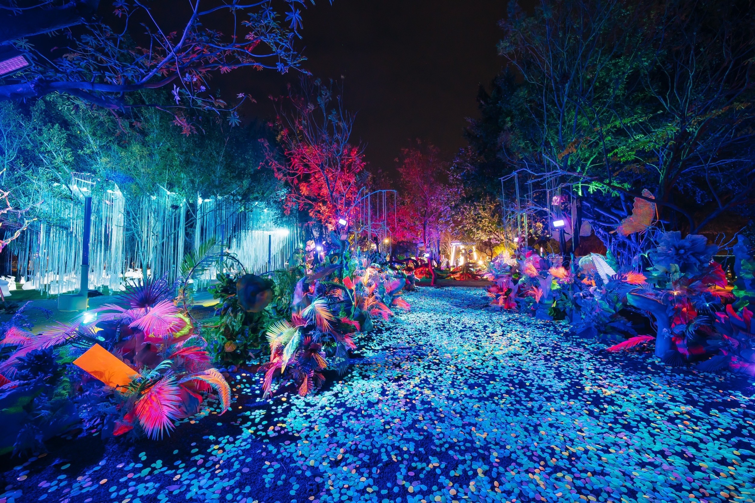 建設局說明,「驚蟄界」展區入口特別打造高達5公尺的「白馬」藝術裝置,以鐵件工藝結合織帶等多元媒材型塑巨型馬首,搭配層層光影設計,日夜呈現截然不同的視覺風貌。夜間在燈光映照下,龐大的馬身更顯神秘夢幻,宛如揭開通往異世界的序章。展區周邊同步營造沉浸式光環境,由主燈引導進入展區動線,沿途以火把燈鋪陳氛圍轉換,奇幻色彩在樹木間流動,彷彿森林甦醒,帶來迷離而震撼的感官體驗。