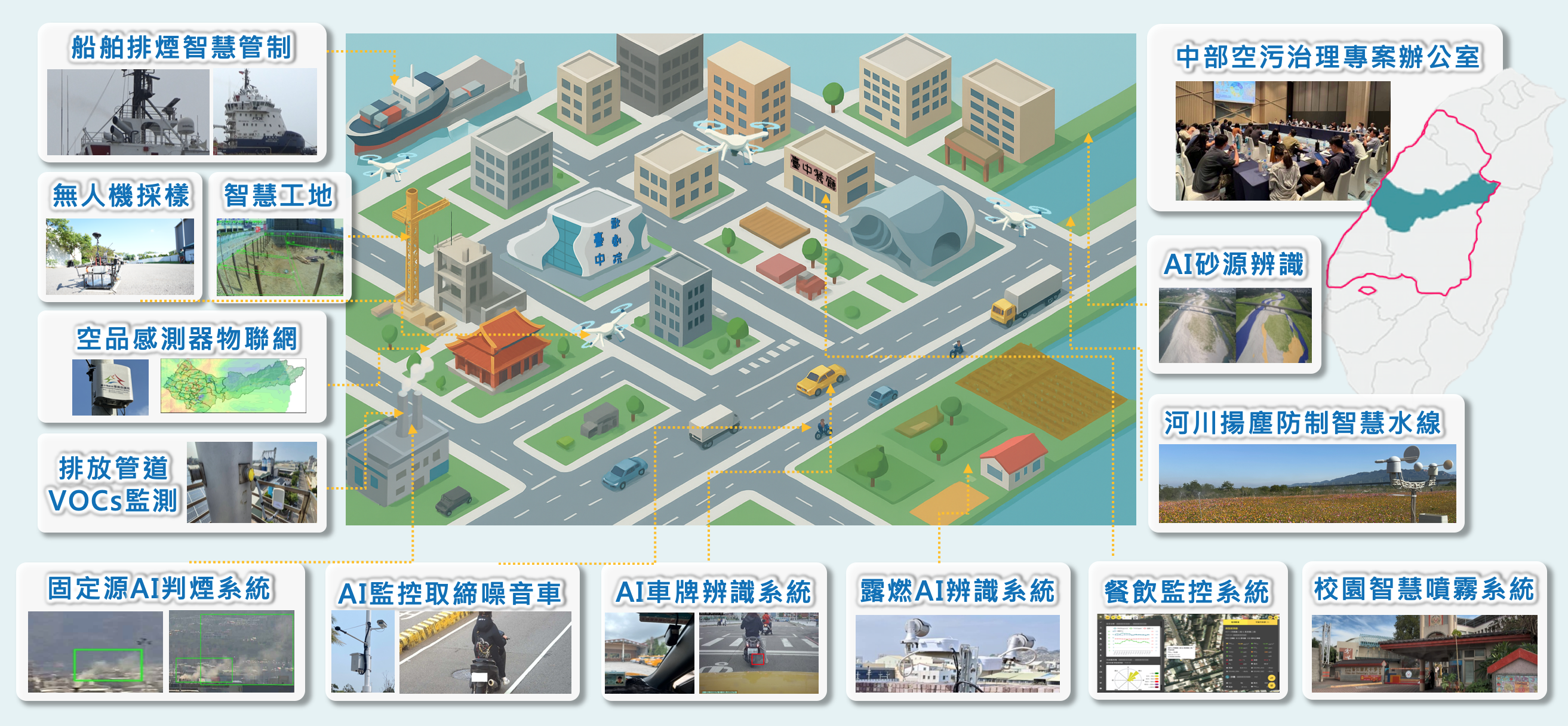 針對逸散污染源,市府運用智慧灑水系統、空拍機搭配AI揚塵與影像辨識技術,即時掌握工地揚塵與露天燃燒情形,並與中央合作試辦河川揚塵抑制措施,成功杜絕河川揚塵事件發生。同時,全市布建逾千台空氣品質感測器,建構綿密監測網絡,並透過雲端影像與數據分析,精準鎖定污染源、提升稽查與執法效能,讓空品守護不受時間與空間限制。