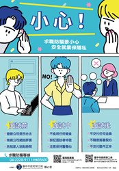 勞工局提醒,學生族群打工須留意徵才廣告的薪資福利是否合於行情,切勿因一時求職心切而降低警覺,尤其現今網路資訊發達,詐騙手法更是在Facebook、Line等社群平台推陳出新,呼籲青少年找尋打工機會時,要多方查證、小心謹慎,避免誤入求職陷阱。若有遇到疑似徵才詐騙的情形,可撥打165反詐騙專線,或可至勞工局網站查看相關資訊(https://www.labor.taichung.gov.tw/1706536/post)或洽詢勞工局04-22289111分機35607。
