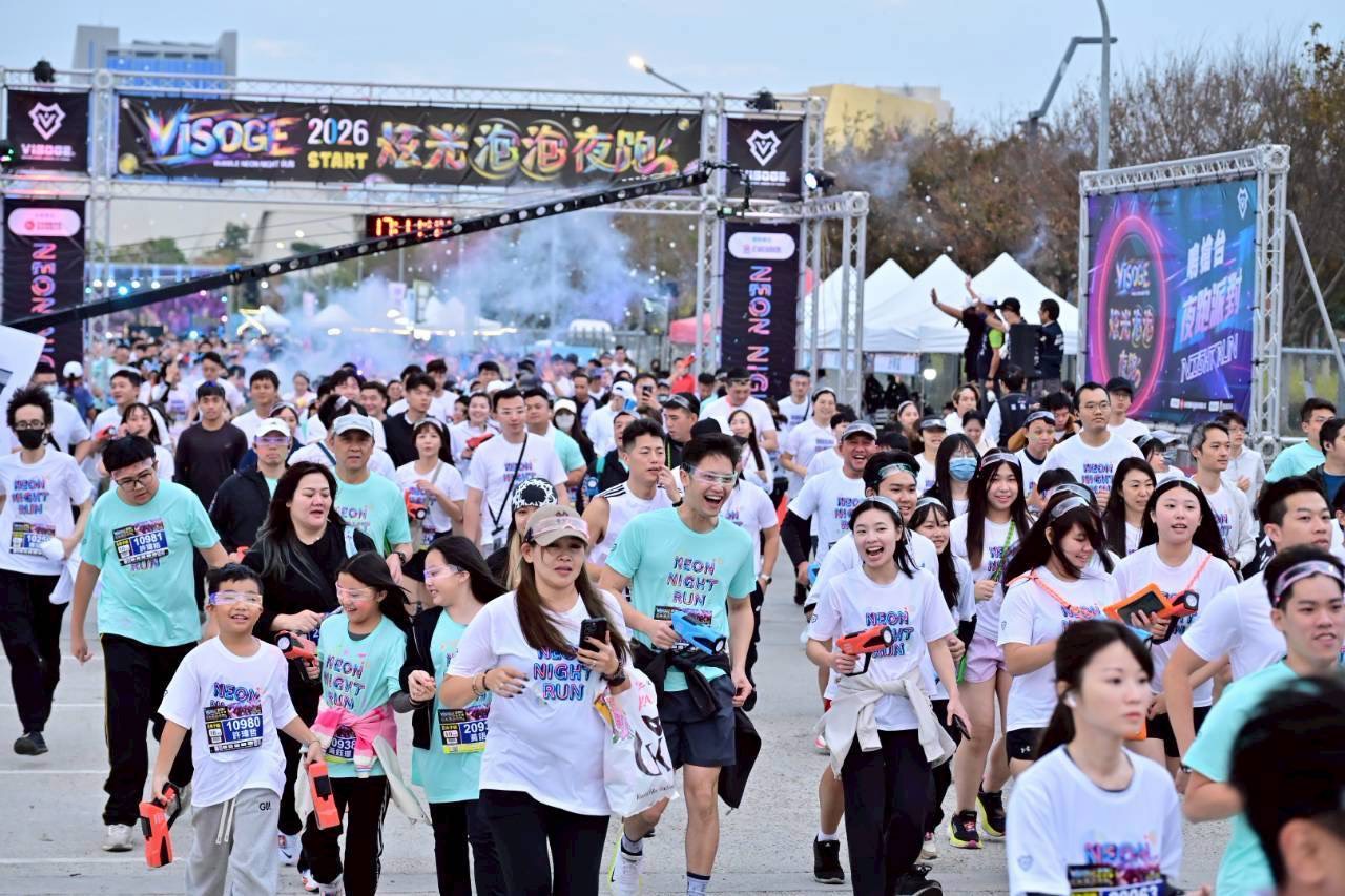 DJ 音樂加上星光派對,最炫、最熱情的「VISOGE 炫光泡泡夜跑」今(17)日下午於中央球場登場,吸引逾五千名跑者與樂迷共襄盛舉。跑者們紛紛穿戴炫光髮箍、手燈、炫光棒等閃亮裝備,也有人塗上炫光顏料,環繞中央公園的賽道在夜幕中閃閃發亮,一掃冬日涼意。終點中央球場會場由 DJ 及樂團接力演出,跑者手持泡泡槍隨節奏搖擺,沉浸在五彩斑斕的星光派對中,享受輕鬆自在的運動時光。