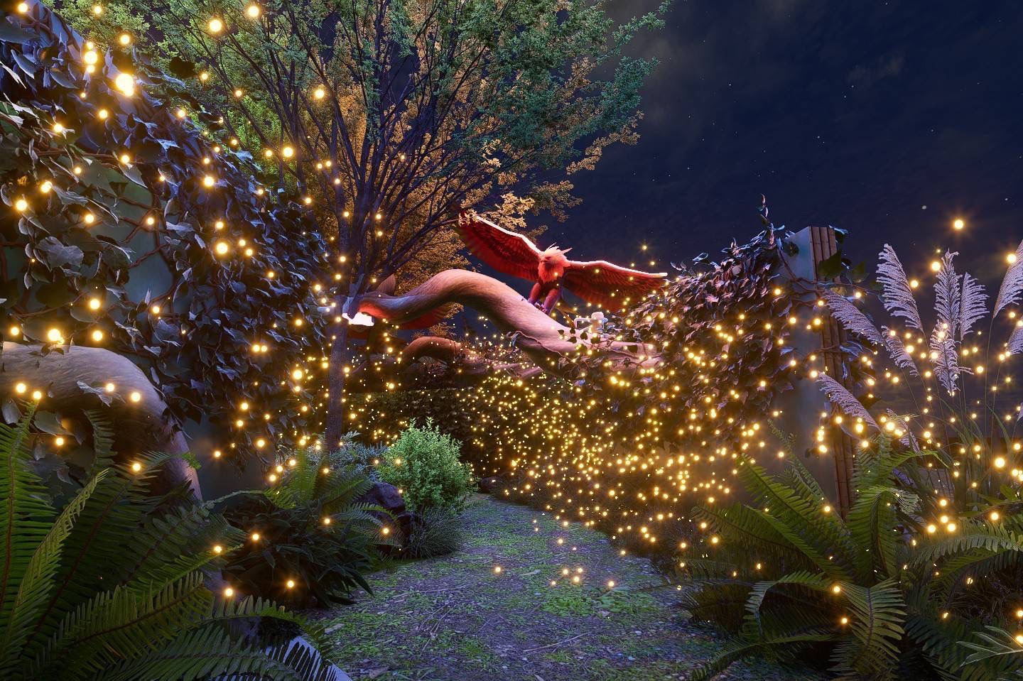 旅程首先將被氣勢磅礴的「馬首引領」震撼,踏入神秘的綠光之森,燈影在林間流動,彷彿瞬間穿越至遠古雨林;耳畔傳來鳥鳴、獸吼與風聲交織,春雷乍響,大地甦醒,萬物在黑夜中悄然復活。沉浸之際,偶然發現林深之處竟藏著一艘遺世獨立的擱淺船骸—「綠舟棲地」,引人無限想像。