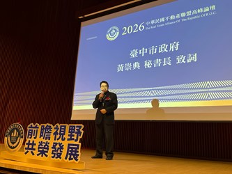 不動產界年度指標活動「2026中華民國不動產聯盟高峰論壇」今(22)日於市府新市政大樓集會堂盛大登場。論壇由台中市不動產聯盟協會主辦,並偕同此府地政局及中市不動產建築開發商業同業公會、中市不動產仲介經紀商業同業公會共同舉辦,此次論壇邀請經濟學家、財金專家專題演講,現場產官學界賢達雲集。中市府秘書長黃崇典代表市長盧秀燕出席致意,期許透過公私部門的深入對話,深度剖析「川普新秩序」下的全球經貿變革,共同擘畫產業前行方向。