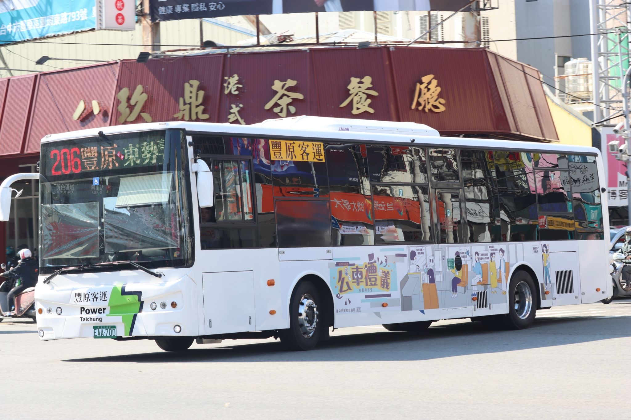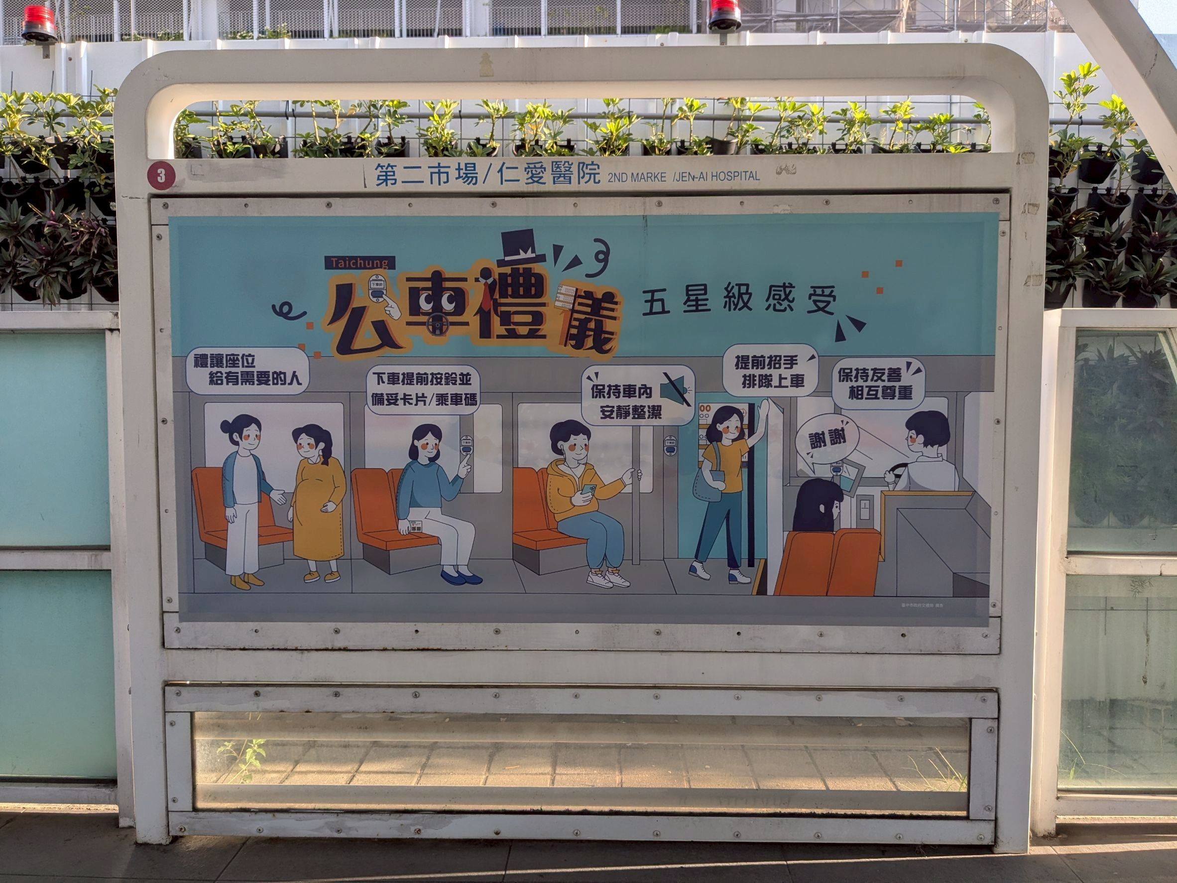 公車是台中市使用頻率最高的公共運具,每日發車8,000班,每年創下近8,000萬人次的旅運量,已是市民生活不可或缺的交通工具。台中市政府交通局為帶動良好乘車文化,推出公車禮儀車體廣告,宣導「保持友善、相互尊重」、「保持車內安靜整潔」、「下車提前按鈴並備妥卡片/乘車碼」、「禮讓座位給有需要的人」及「提前招手、排隊上車」,從小細節改變公車體驗,讓大眾運輸服務邁向五星級。