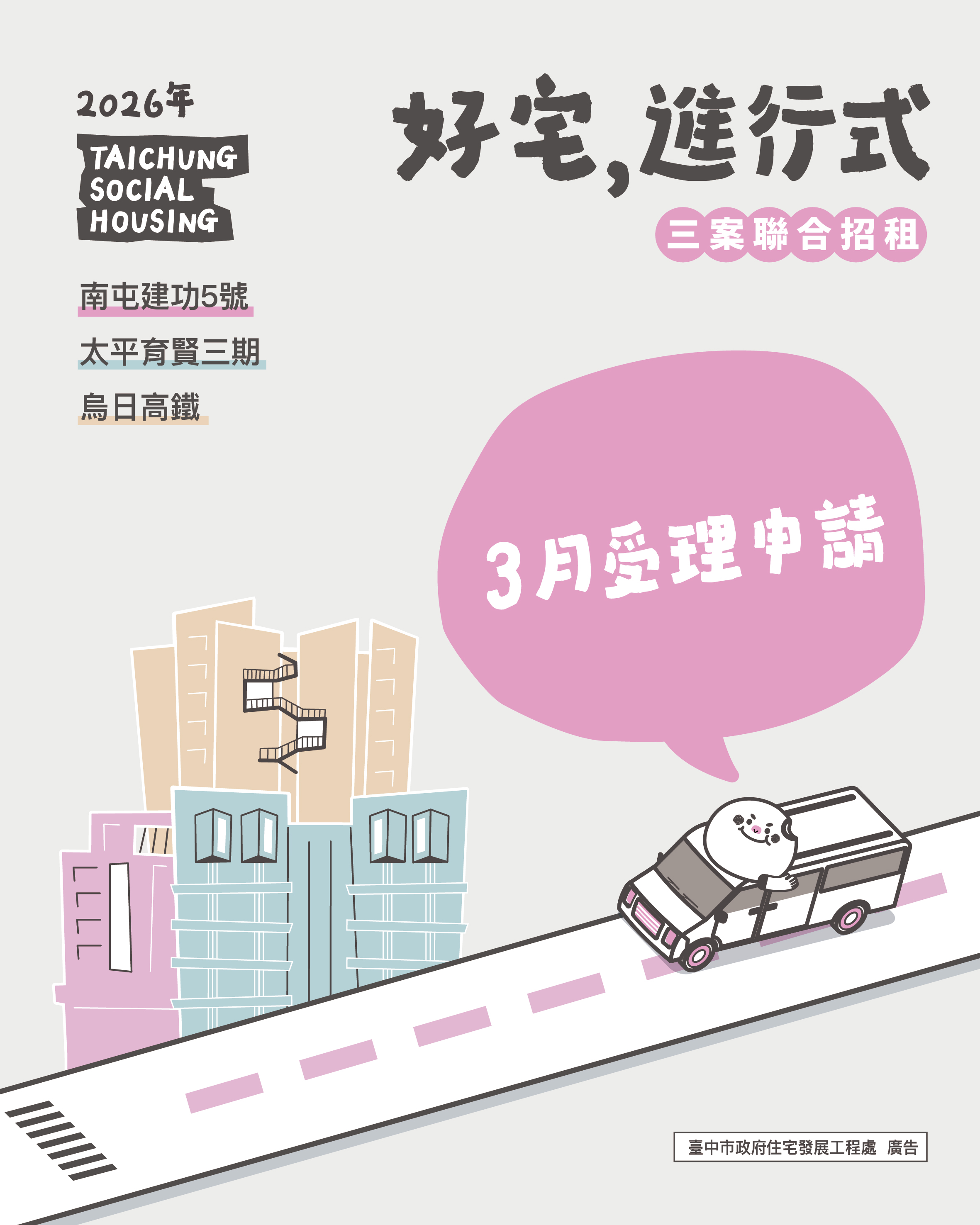 住宅處提醒,此次聯合招租作業相關資訊將於115年3月開放受理申請,屆時將公告申請資格及相關作業期程,歡迎有居住需求的民眾密切留意相關資訊。如有相關問題,可至台中市政府住宅發展工程處網站(https://thd.taichung.gov.tw/)、台中市社會住宅17租網站(https://17zu.taichung.gov.tw/Portal)查詢,或電洽04-22289111分機69300。