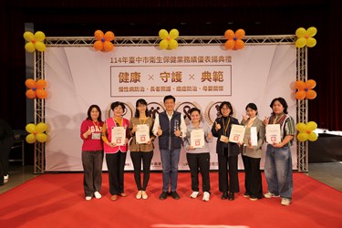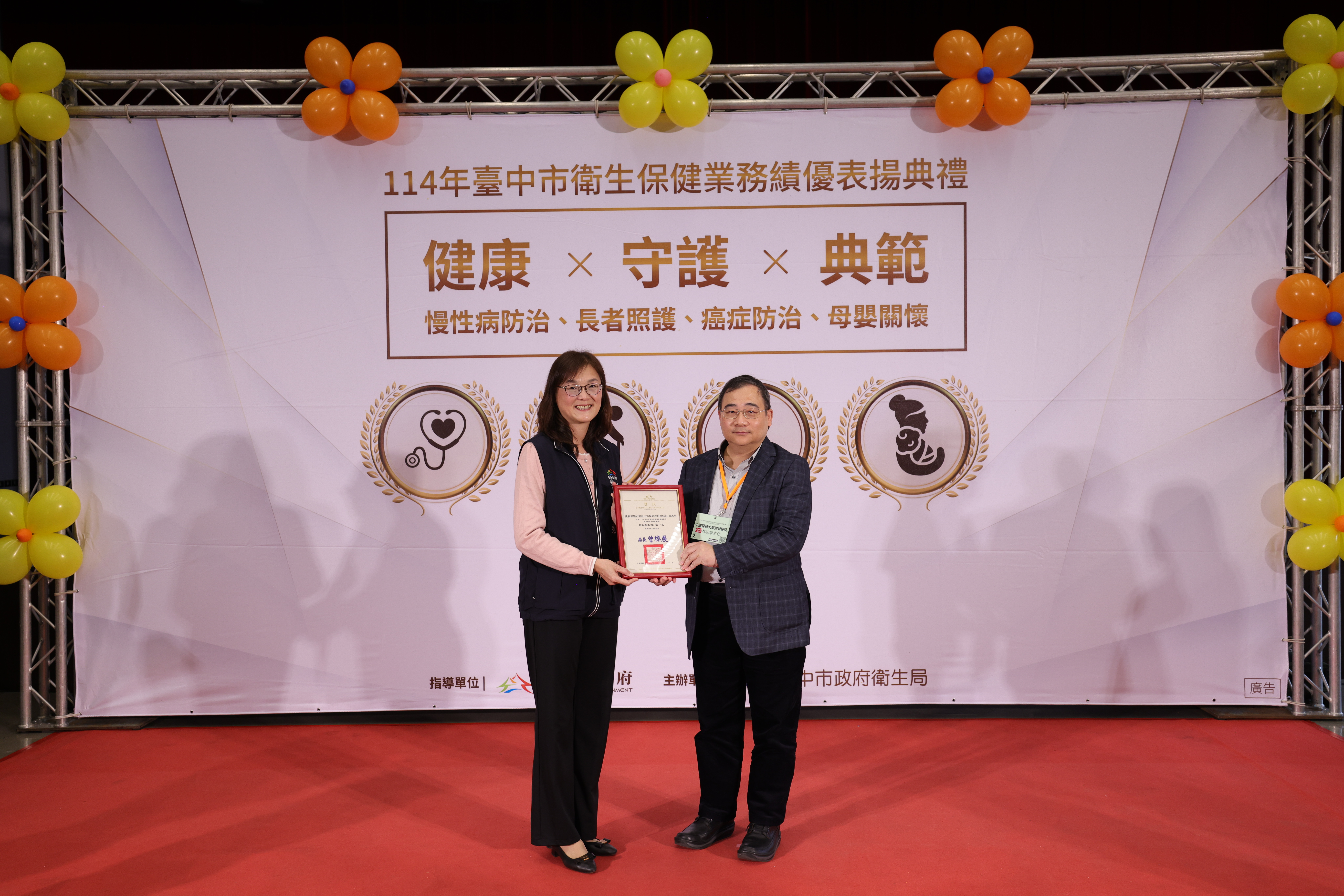 為感謝台中市醫療院所及衛生醫事相關單位長期投入公共衛生業務、共同守護市民健康,台中市政府衛生局今(28)日在市政府舉辦「114年度台中市衛生保健業務績優表揚典禮」,表揚176家醫療院所、藥局、公協會、基金會及照護機構等績優單位。典禮中共頒發1項感謝狀、5項獎項及1項認證標章,肯定各界在婦幼照護、癌症防治、慢性病防治、戒菸服務、預防及延緩失能,以及健康醫院推動等面向的卓越貢獻,攜手築起市民健康防線。