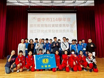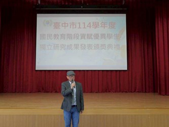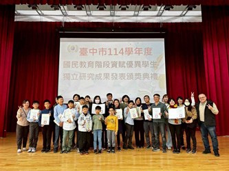 台中市政府教育局今(29)日在成功國中舉辦「114學年度國民教育階段資優學生獨立研究成果發表會」,共計131件研究作品投稿,經專家學者審慎評選後,選出5件特優、8件優等、11件甲等及9件佳作,合計33件優秀作品、118位學生及指導教師獲獎。教育局長蔣偉民親自出席頒獎典禮,並邀請獲獎學生進行成果發表、指導教師分享教學歷程,現場學術交流氣氛熱絡。
