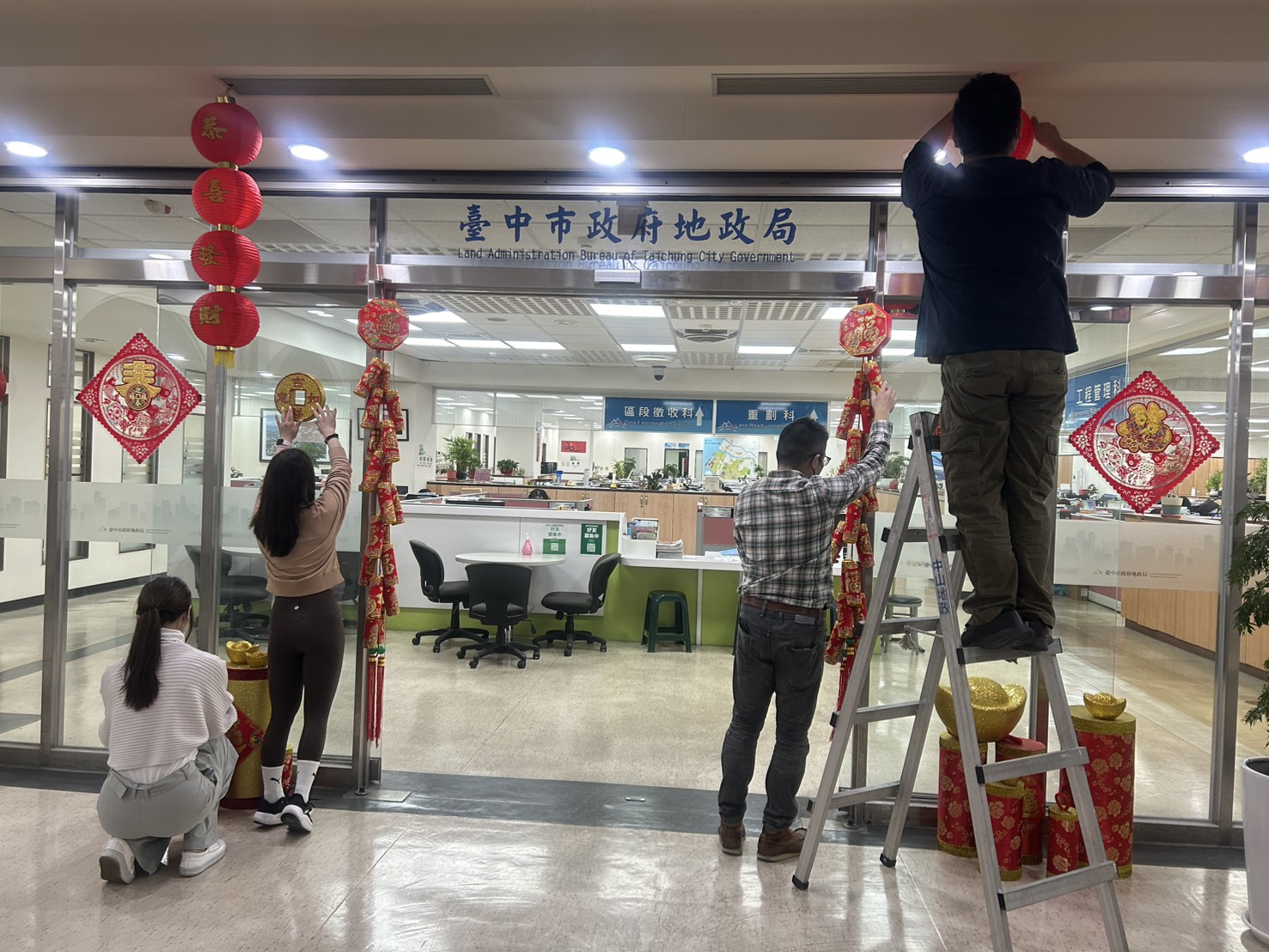 農曆春節將至,台中市政府地政局響應「台中清潔月」活動,於昨(29)日辦理「逗陣來摒厝」環境清潔行動,由同仁共同動手整理辦公場所及周邊環境,並布置春節應景飾品,營造整潔、明亮又充滿年節氣息的洽公空間,同時落實登革熱防治工作,為迎接新春做好萬全準備。