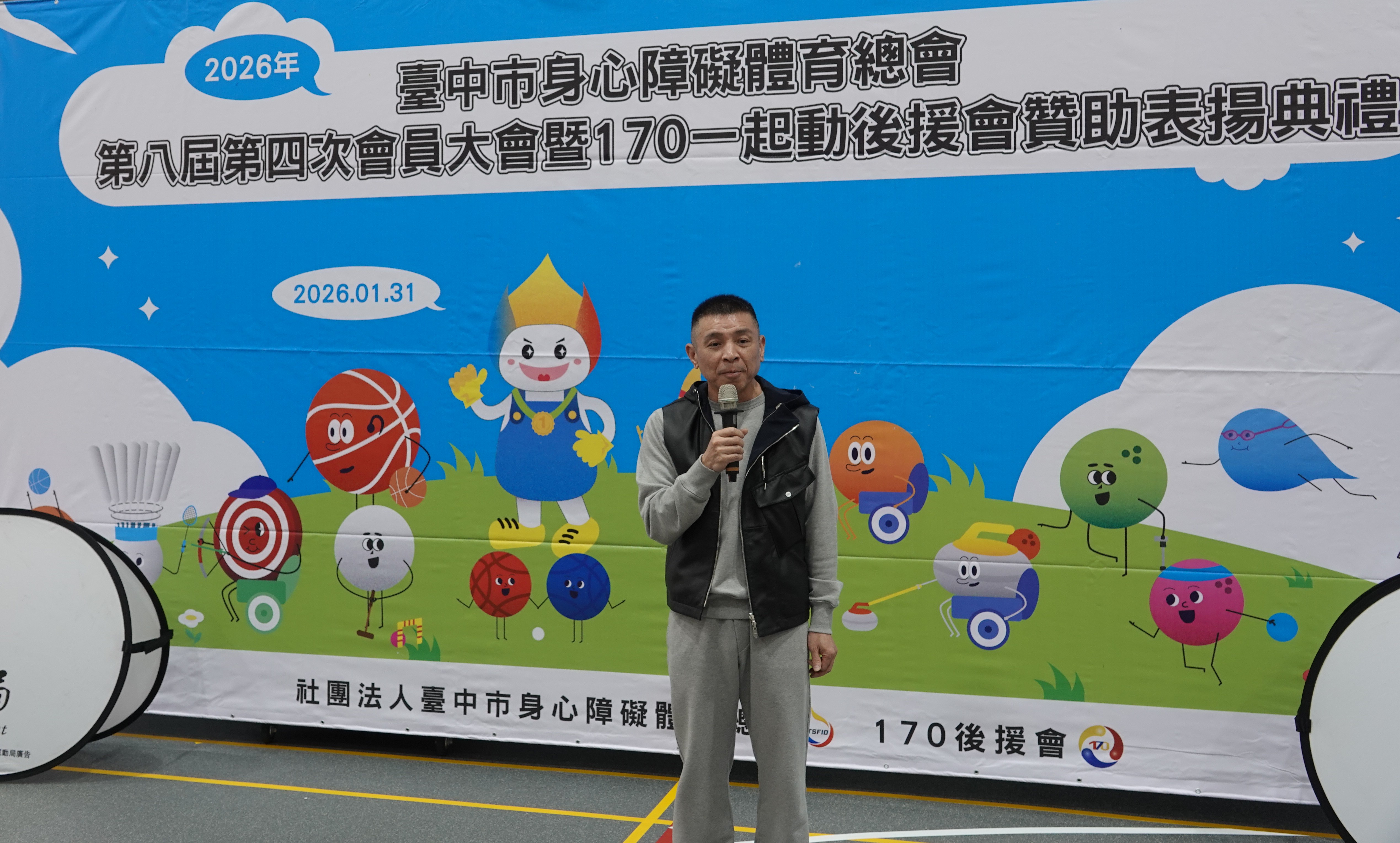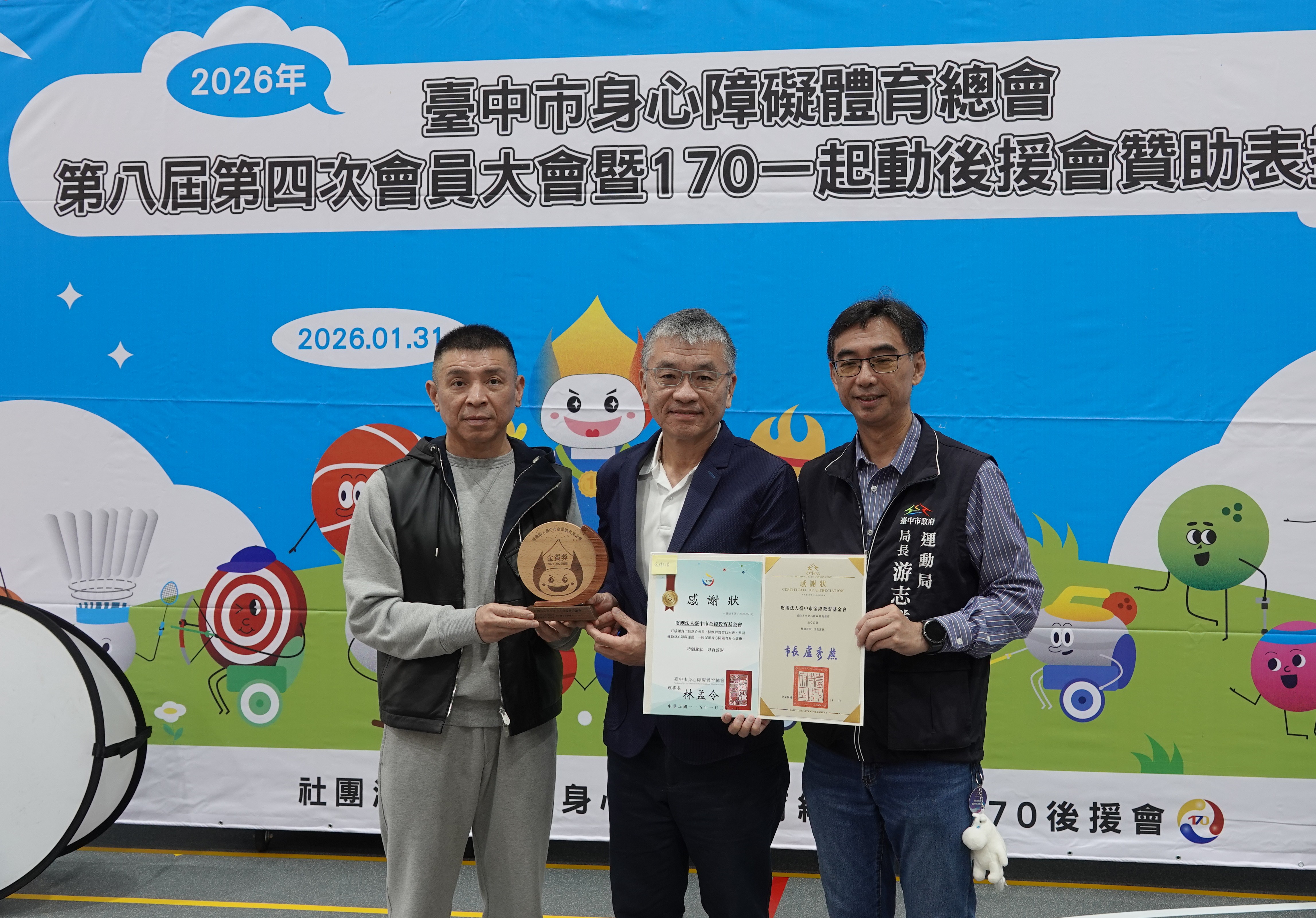台中市身心障礙體育總會今(31)日召開「台中市身心障礙體育總會會員大會暨年度表揚典禮」,台中市政府運動局長游志祥代表市長盧秀燕到場支持,感謝林孟令理事長和台中市身心障礙體育總會,近年來持續推動多場適合身障者參與的運動賽事與活動,也感謝志工夥伴及各體育運動團體等單位對身障運動的支持和推廣,讓身障運動風氣發展蓬勃,共同見證台中市在身障體育領域的亮眼成果,展現「酷運動、酷城市」的溫暖韌性。