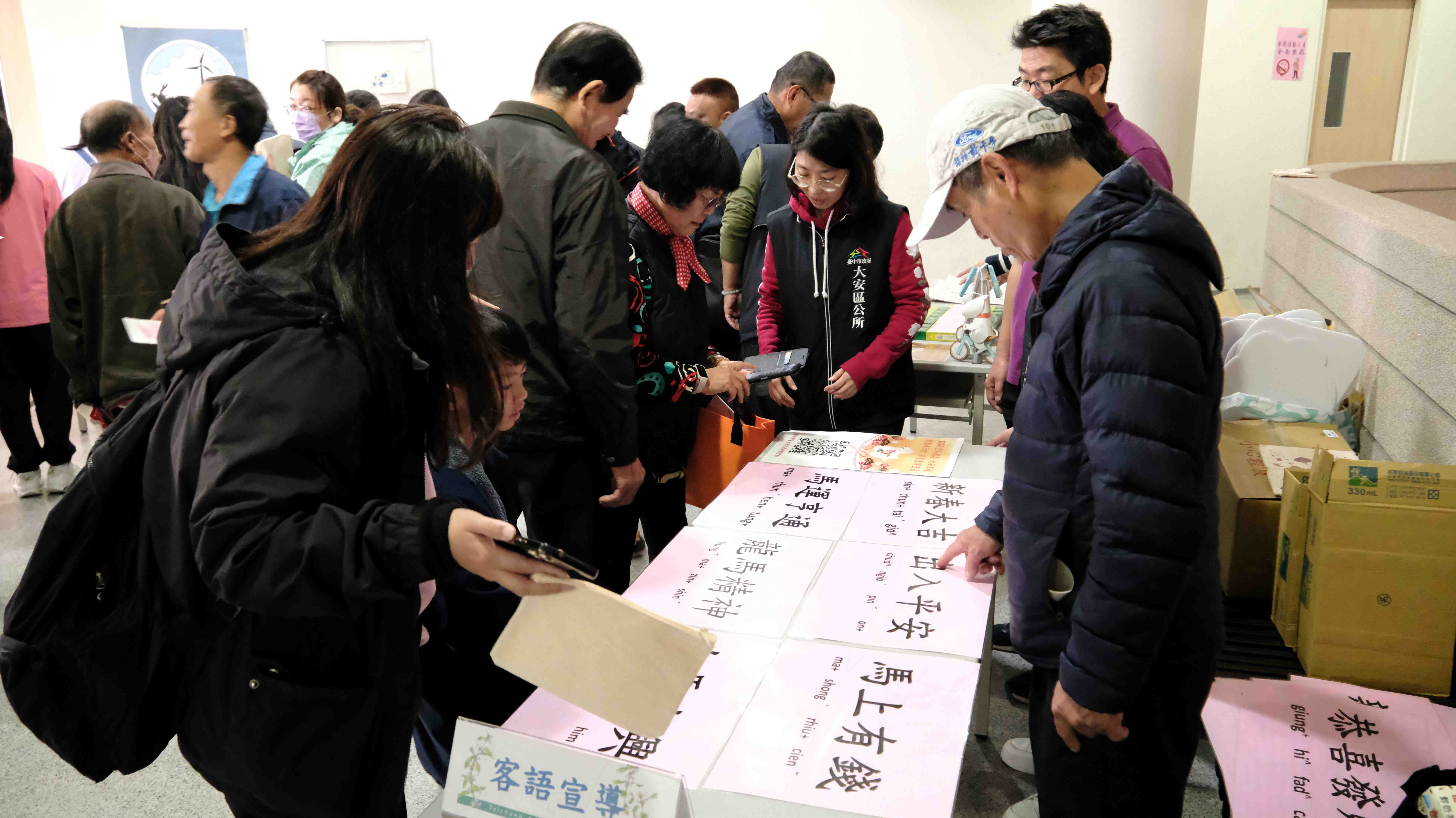 客委會說明,今年延續往年與區公所合作辦理兩場次的揮毫活動,除了今日在大安區的活動外,下週六(2/7)在大甲區公所大廳還有一場充滿客家風情的揮毫活動,歡迎市民朋友都能攜老帶幼一同來感受年節的歡快氣氛。