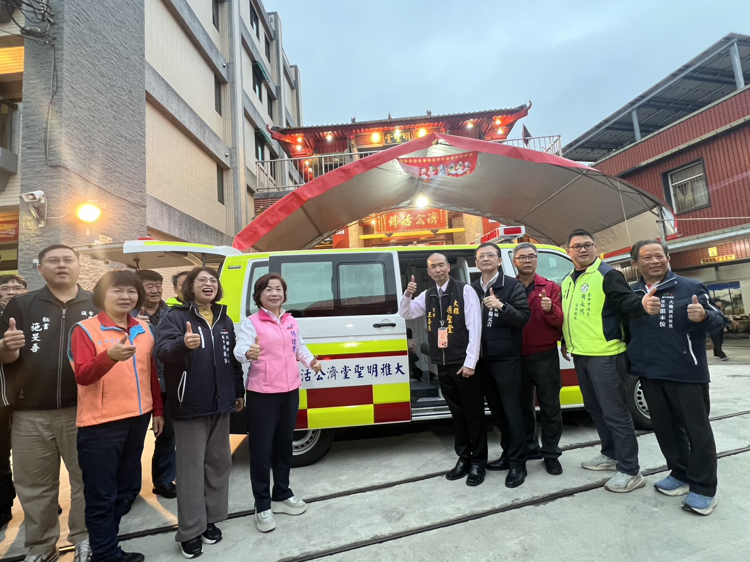 明聖堂住持王嘉德先生表示,急救現場往往分秒必爭,一輛功能完善、設備齊全的救護車,對於搶救生命具有關鍵性的意義。感謝所有信徒的共同支持,讓這份眾人的愛心得以圓滿實現。楊副局長說,受贈的救護車命名為「明聖堂號」,代表著大家的祝福與發心,期盼它能在最危急的時刻即時出勤,如同神明庇佑般,守護大雅區及鄰近地區每一位鄉親的生命安全。