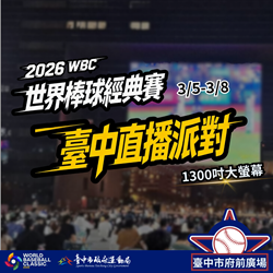 為迎接中華隊於3月5日至8日的預賽關鍵賽事,市府同步規劃於府前廣場舉辦大型賽事直播活動,將以1,300吋超大螢幕即時轉播比賽,並結合限時應援市集,集結在地美食與棒球主題攤位,營造如同親臨球場般的觀賽氛圍,邀請全國球迷齊聚台中,為中華隊加油應援。